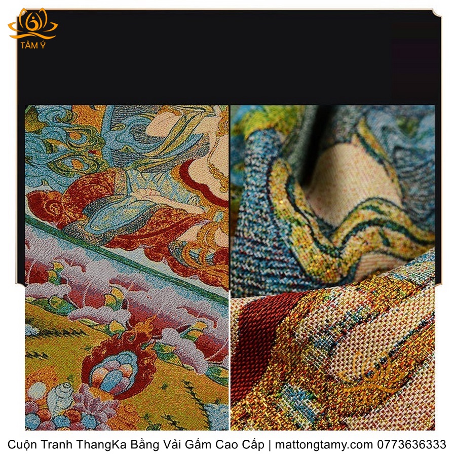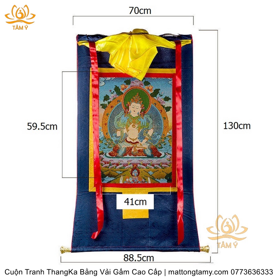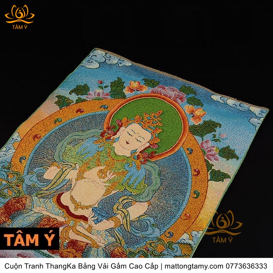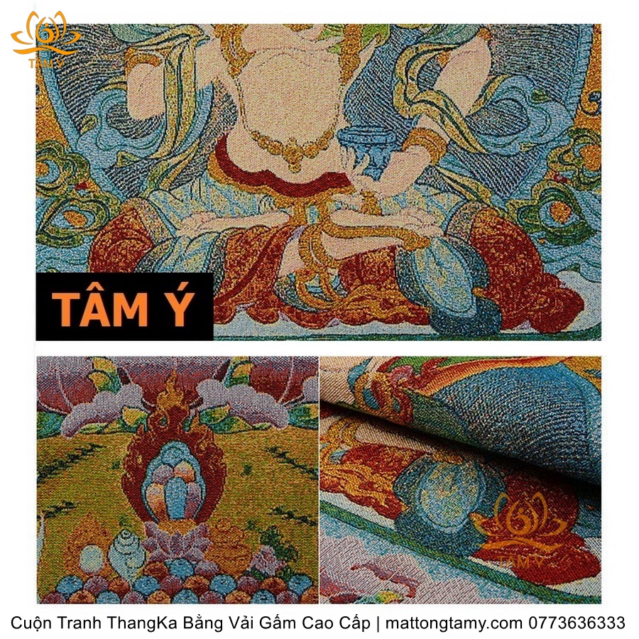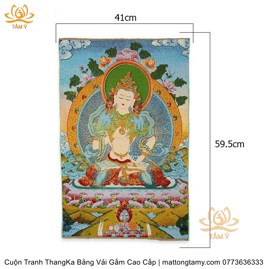 Chất liệu: Vải gấm cao cấp. Thêu dệt hình tướng: Kim Cang Tát Đỏa (Vajrasattva). Kích thước: dài: 130cm, rộng phía trên: 70cm, rộng phía dưới: 88.5cm. Tranh thêu xong sẽ được may lên khung bằng vải gấm, 2 đầu tranh là thanh gỗ quý.