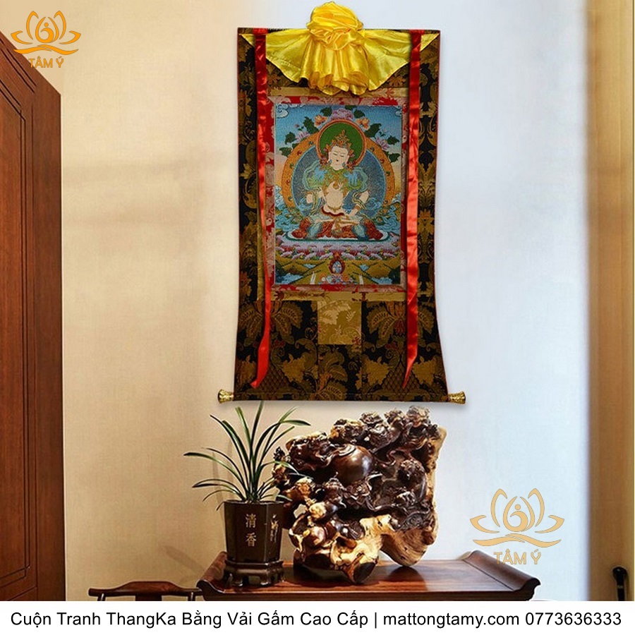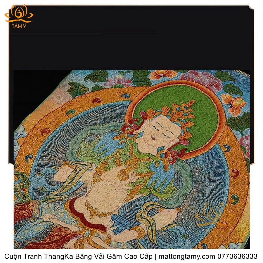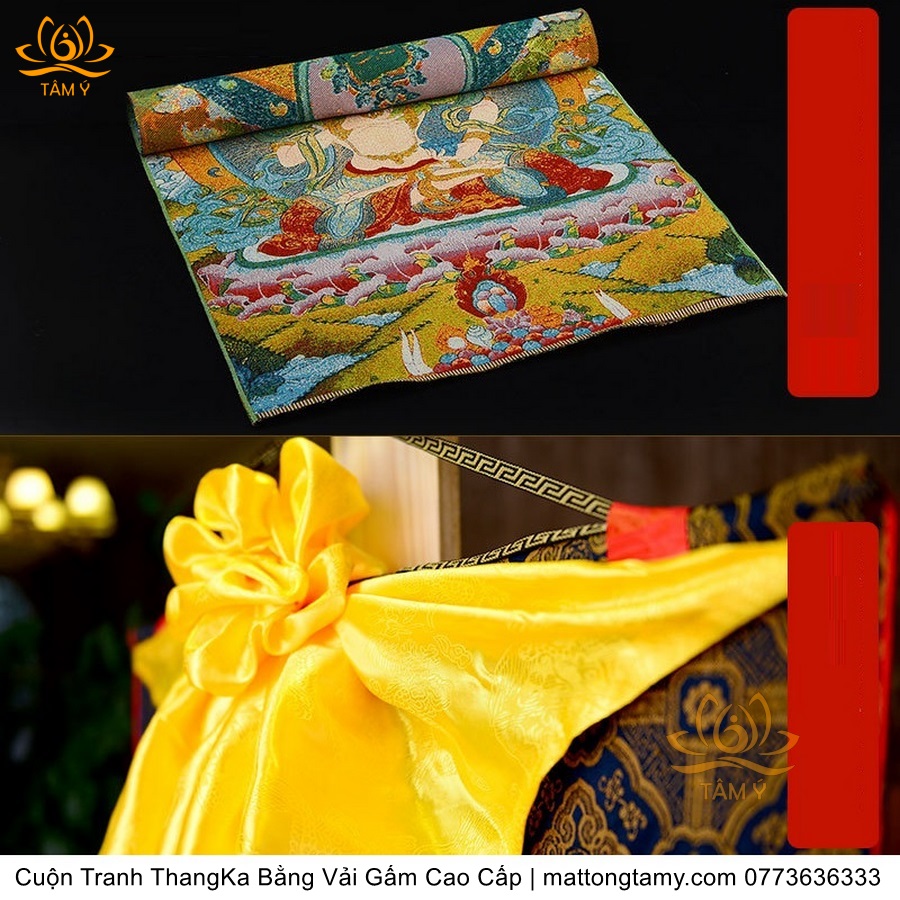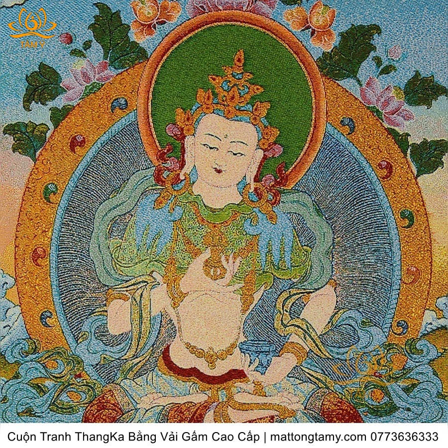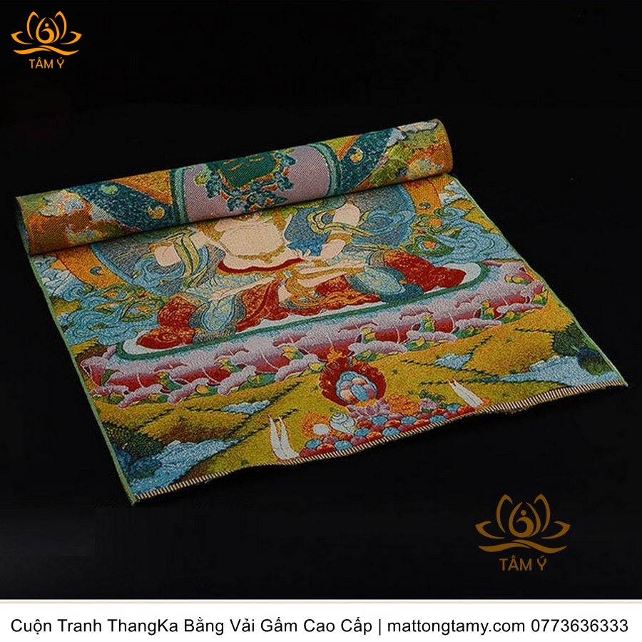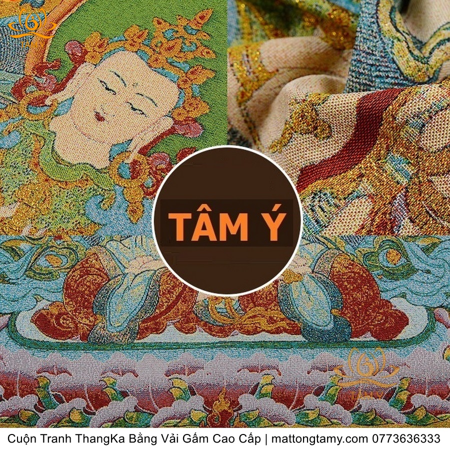 Chất liệu: Vải gấm cao cấp. Thêu dệt hình tướng: Kim Cang Tát Đỏa (Vajrasattva). Kích thước: dài: 130cm, rộng phía trên: 70cm, rộng phía dưới: 88.5cm. Tranh thêu xong sẽ được may lên khung bằng vải gấm, 2 đầu tranh là thanh gỗ quý.