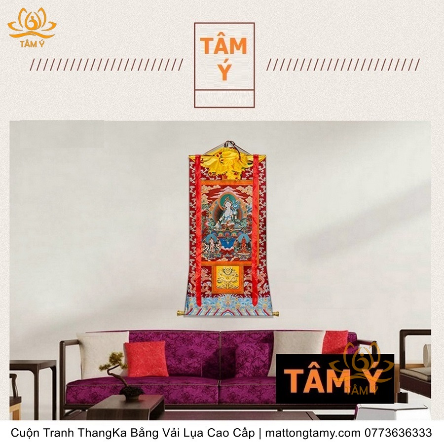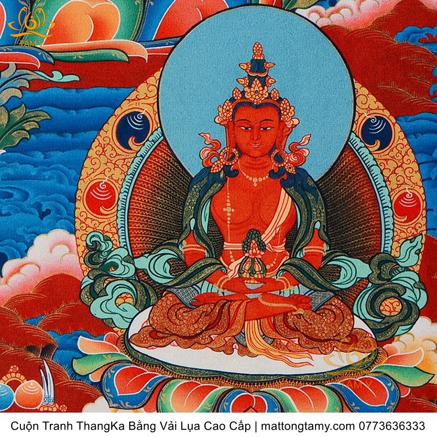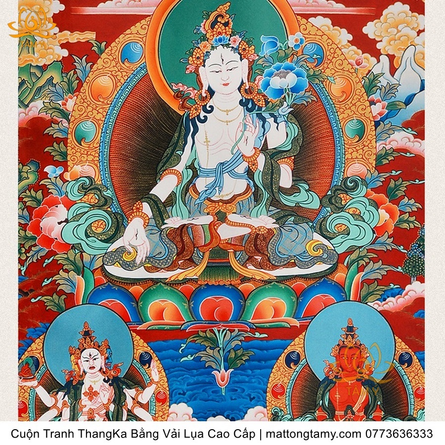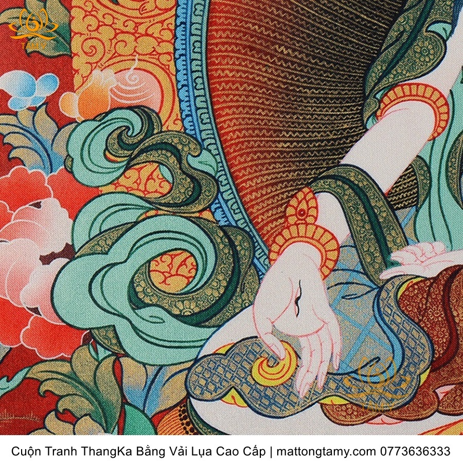 Chất liệu: Vải gấm cao cấp. In: Văn Thù Bồ tát. Tranh vẽ máy nhiều lớp công nghệ cao rất sắc nét, màu sắc tươi sáng, độ hoàn mỹ xuất sắc. Kích thước: dài: 130cm, rộng phía trên: 70cm, rộng phía dưới: 88.5cm. Tranh vẽ máy trên lụa, rồi in(may) lên khung bằng vải gấm, 2 đầu tranh là thanh gỗ quý.