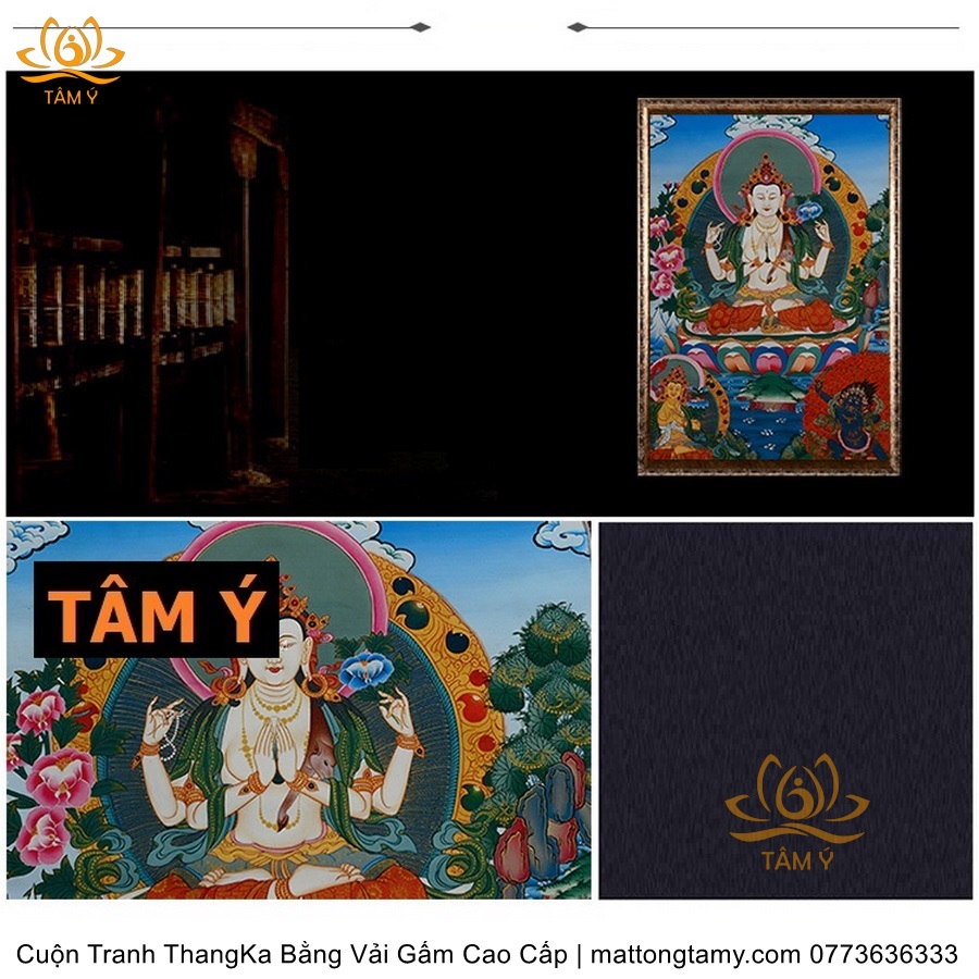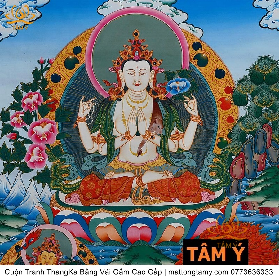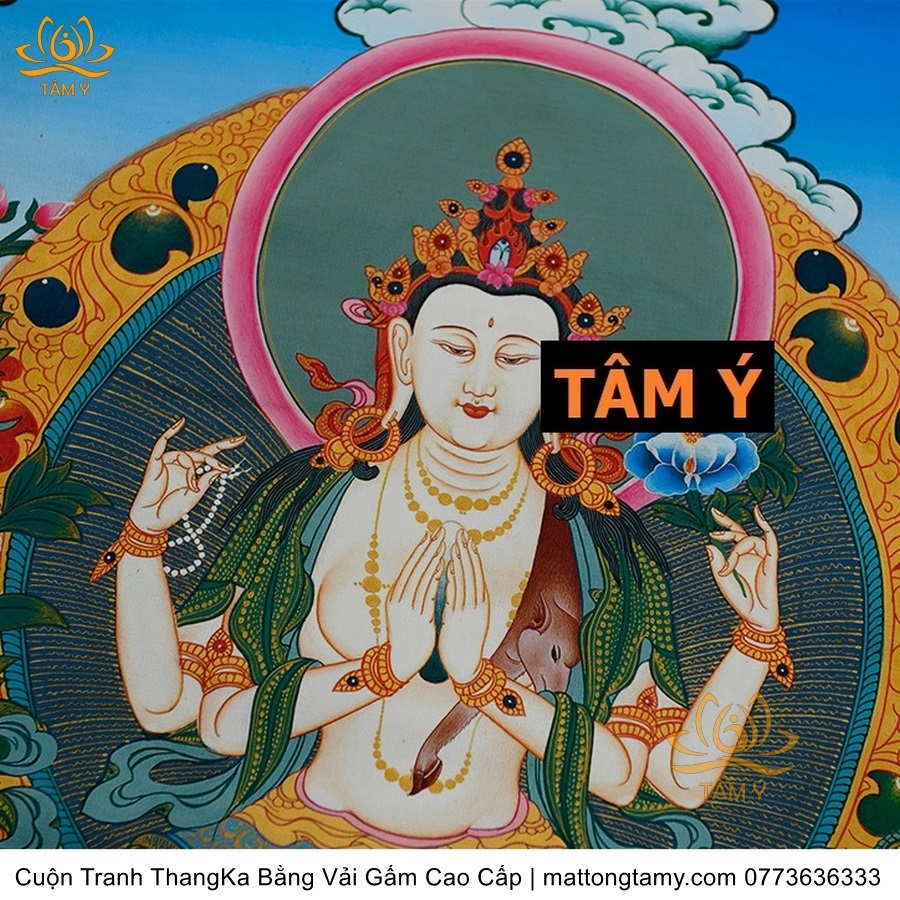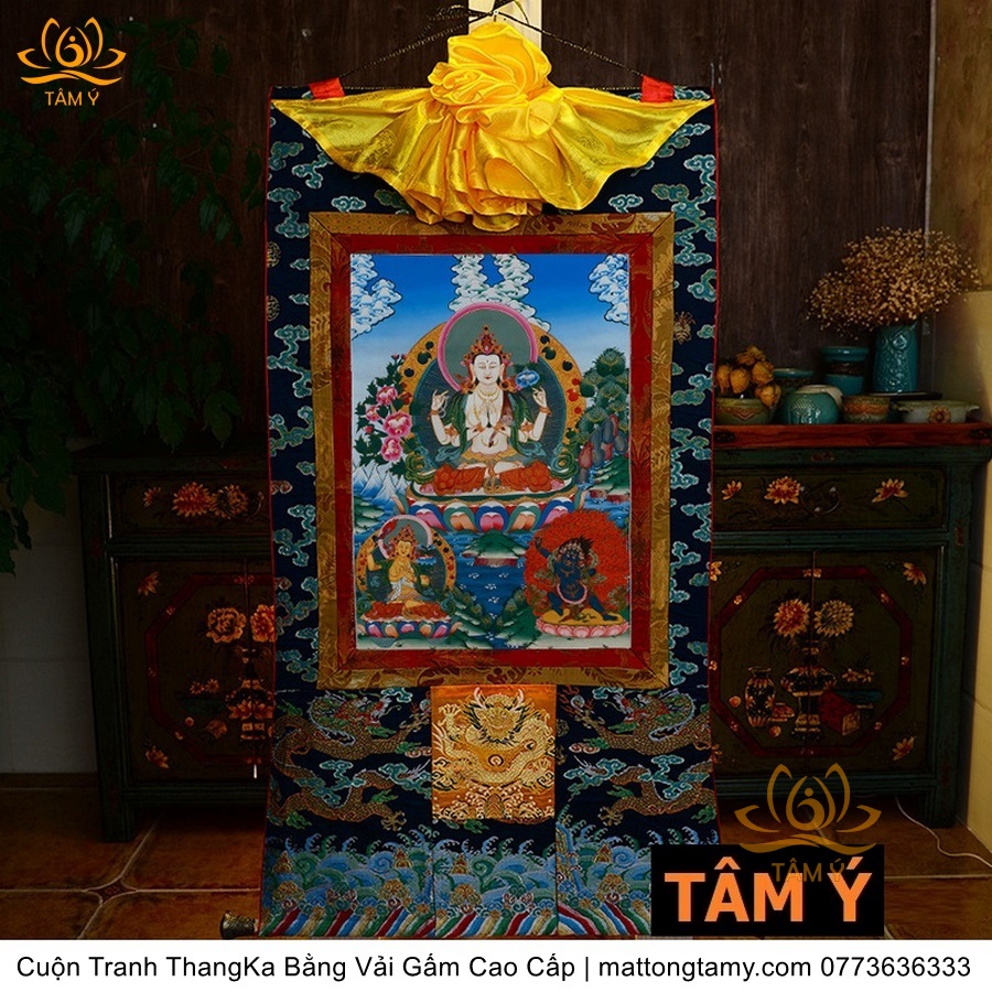Cuộn Tranh ThangKa Ngài Quan Âm Tứ Thủ Bằng Vải Gấm Cao Cấp, Kiểu 4, TCT84