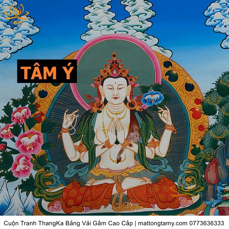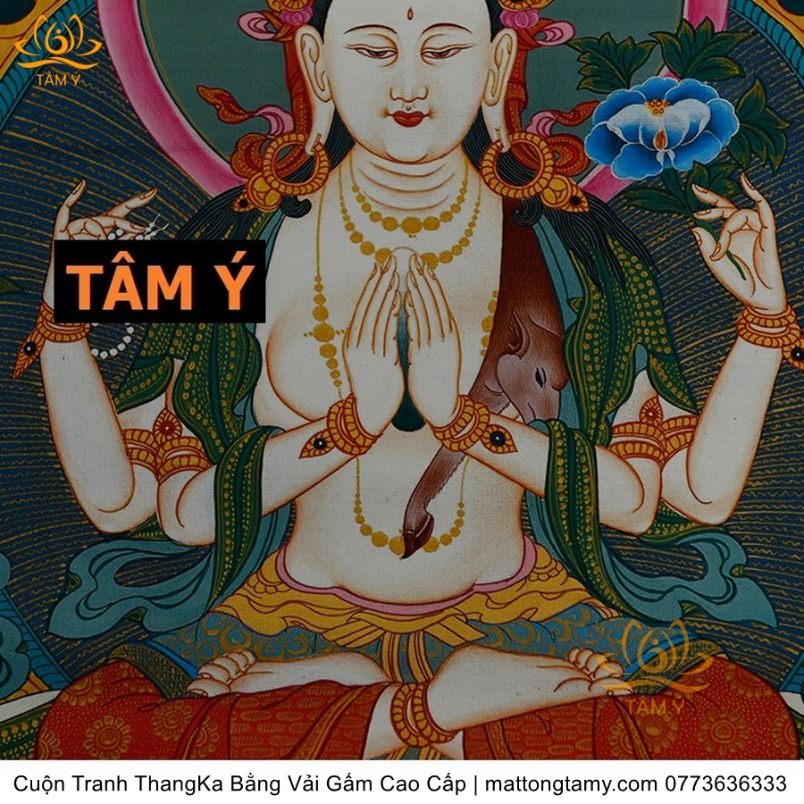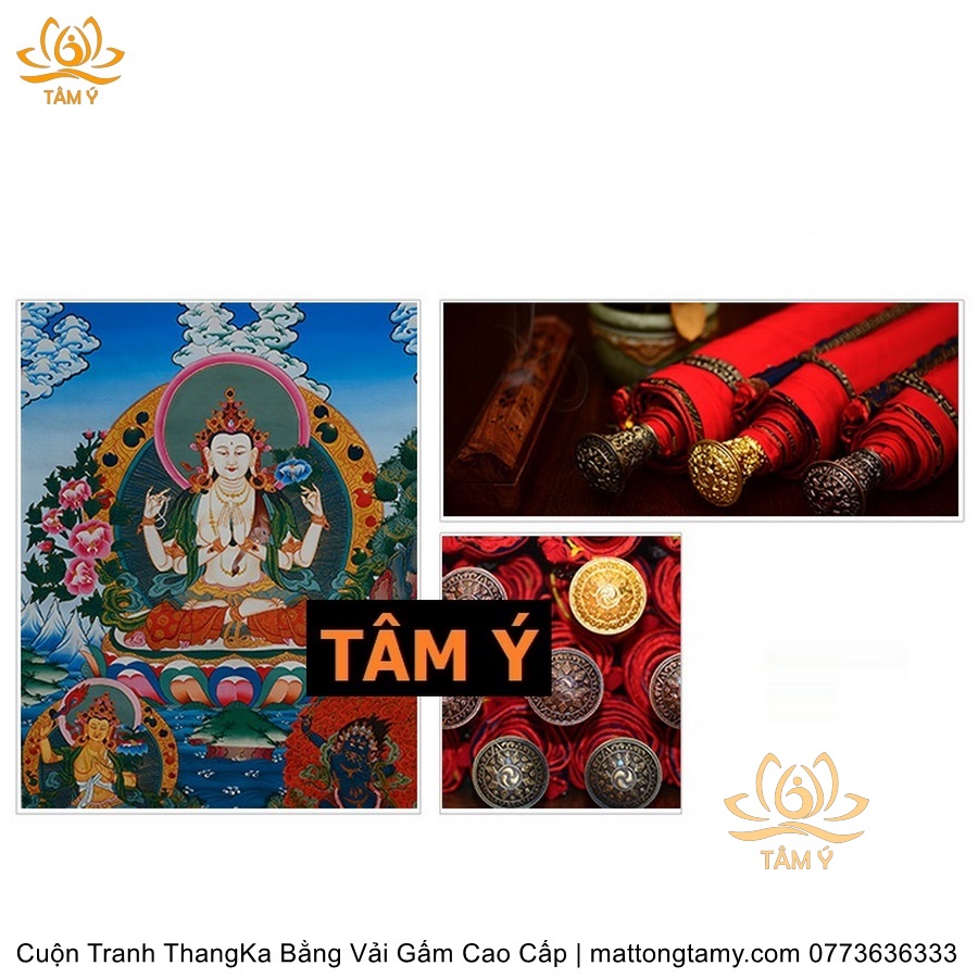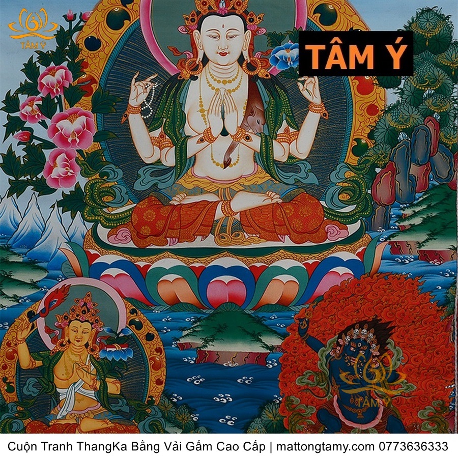 Cuộn Tranh ThangKa Ngài Quan Âm Tứ Thủ Bằng Vải Gấm Cao Cấp, Kiểu 4, TCT84