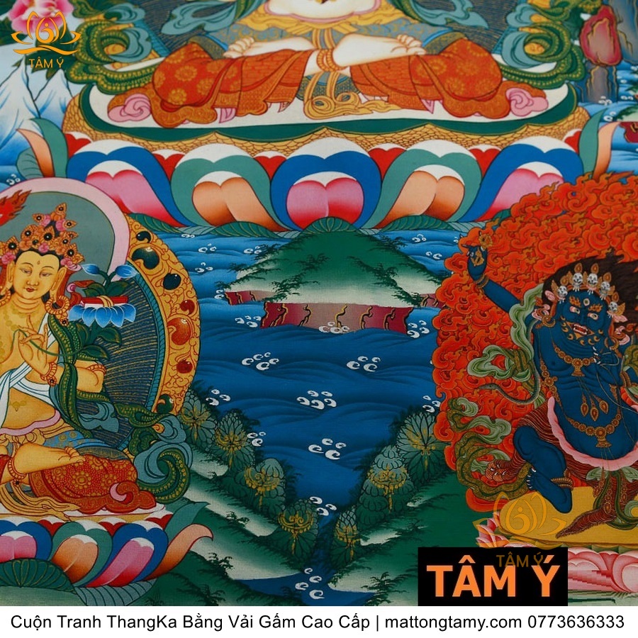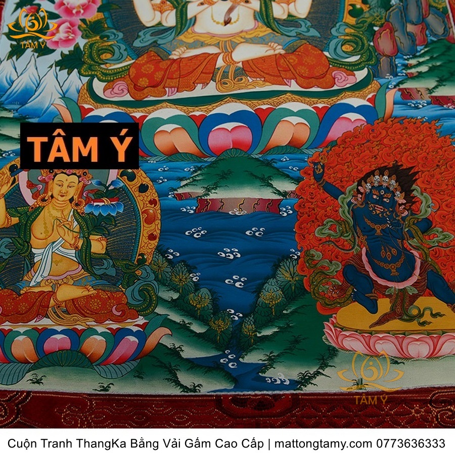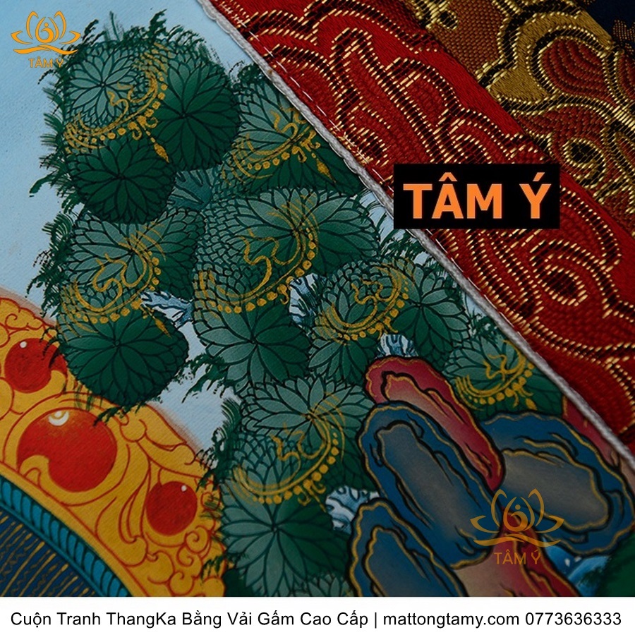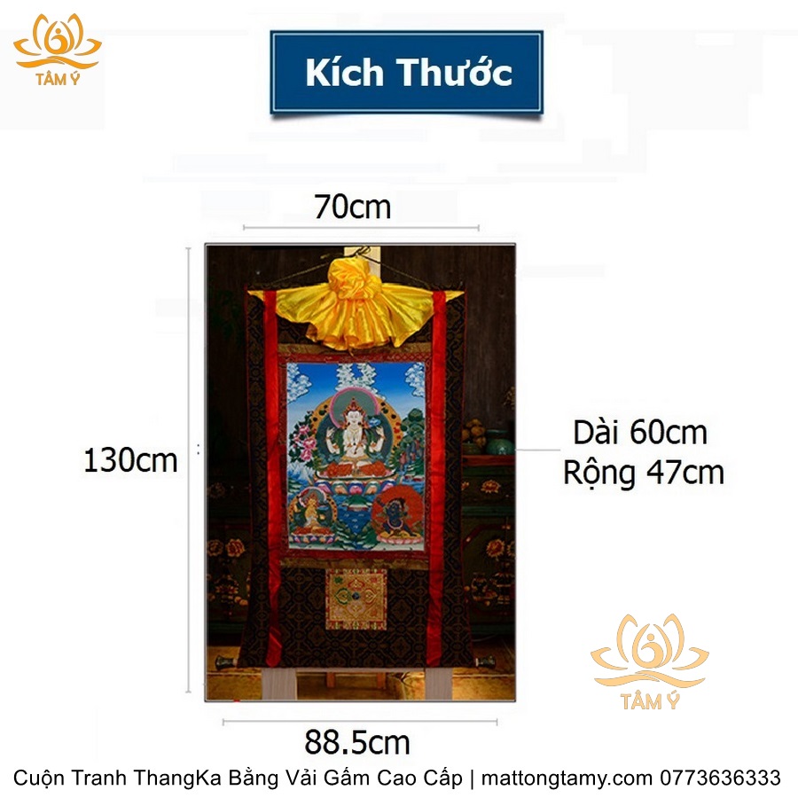 Chất liệu: Vải gấm cao cấp. In: Quan Âm Tứ Thủ. Kích thước: dài: 130cm, rộng phía trên: 64cm, rộng phía dưới: 84cm. Tranh vẽ máy nhiều lớp công nghệ cao rất sắc nét, màu sắc tươi sáng, độ hoàn mỹ xuất sắc. Tranh vẽ máy trên lụa, rồi may lên khung bằng vải gấm, 2 đầu tranh là thanh gỗ quý.