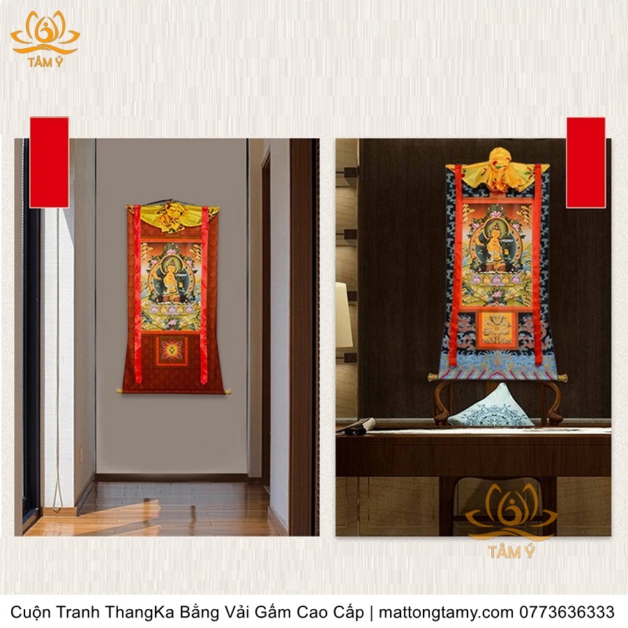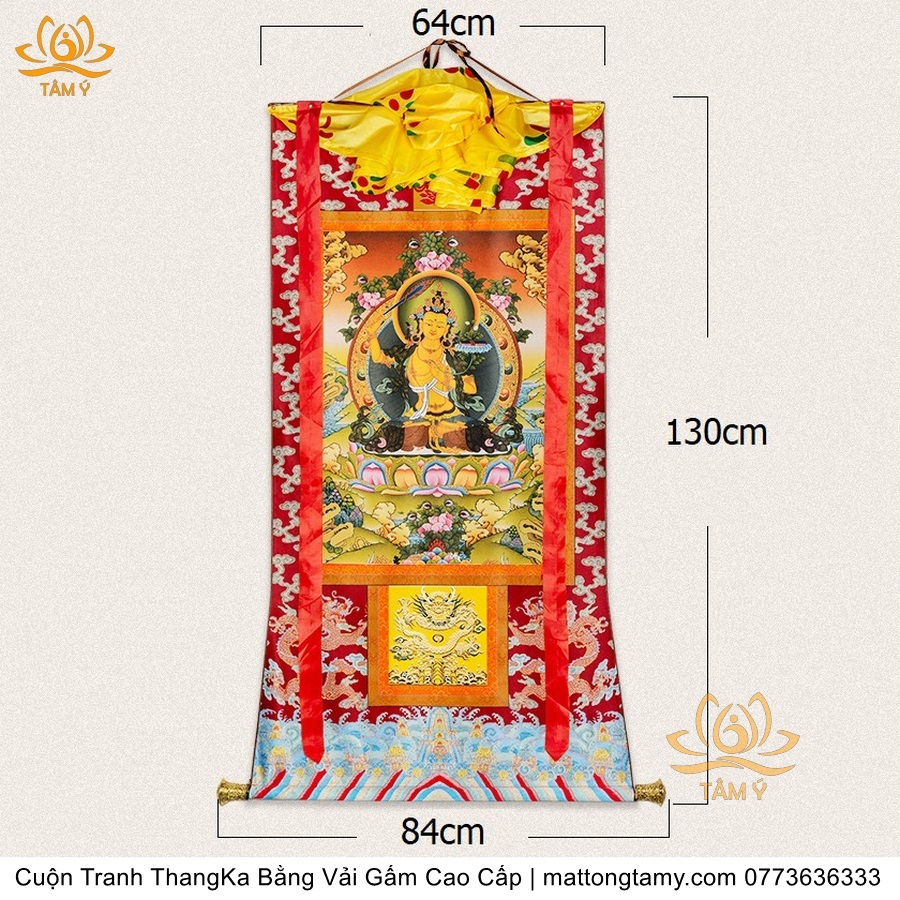 Chất liệu: Vải gấm cao cấp. In: Văn Thù Bồ tát. Kích thước: dài: 130cm, rộng phía trên: 64cm, rộng phía dưới: 84cm. Tranh vẽ máy nhiều lớp công nghệ cao rất sắc nét, màu sắc tươi sáng, độ hoàn mỹ xuất sắc. Tranh vẽ máy trên lụa, rồi may lên khung bằng vải gấm, 2 đầu tranh là thanh gỗ quý.