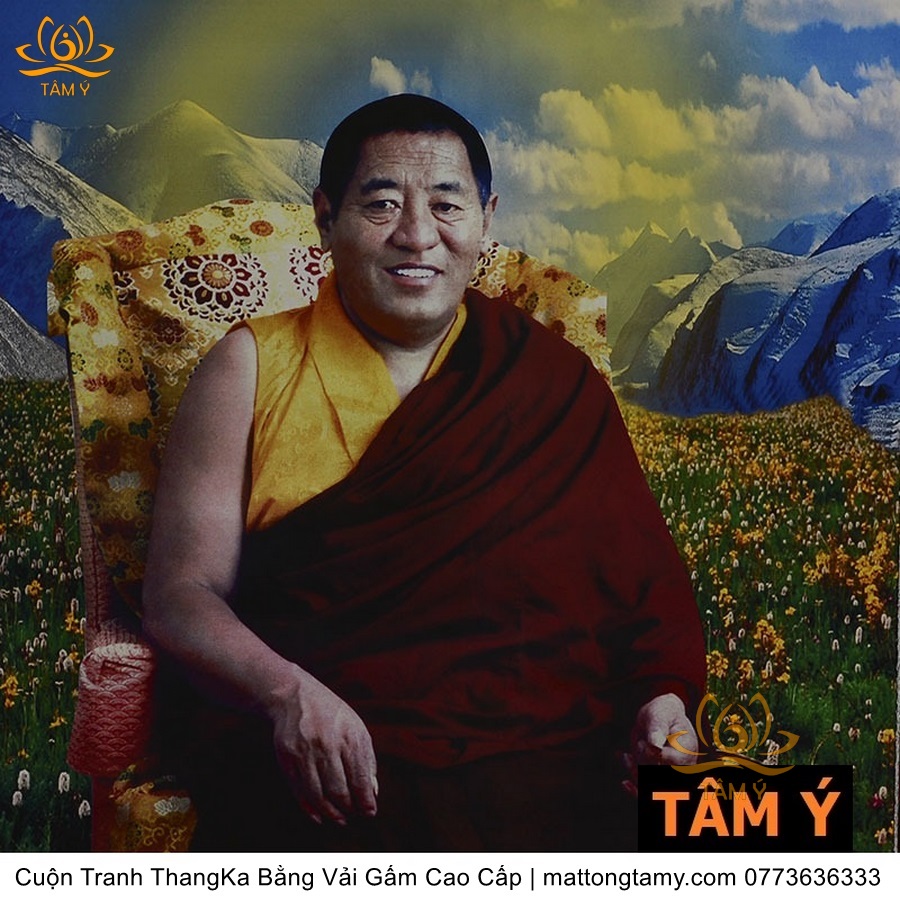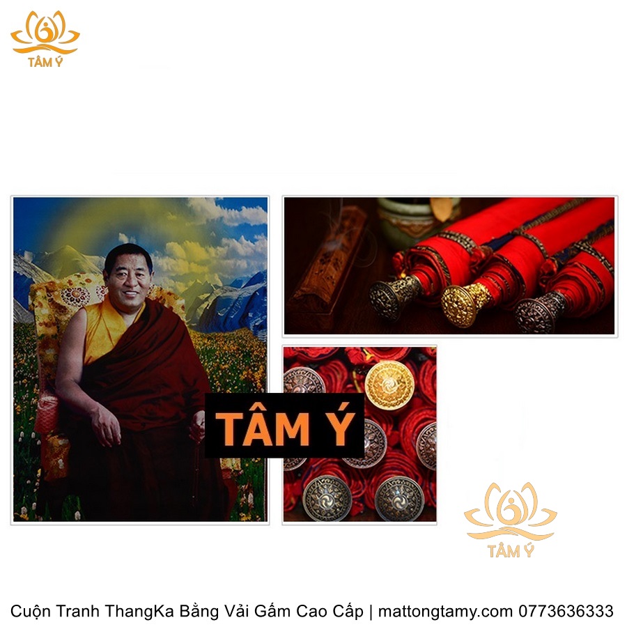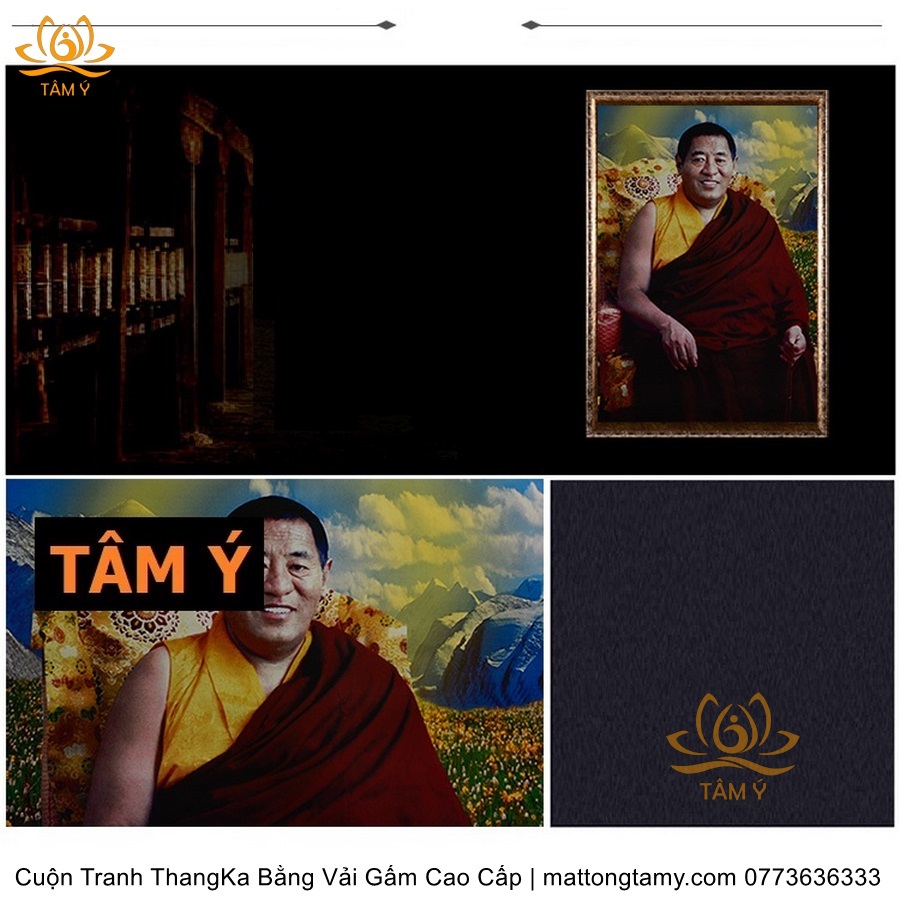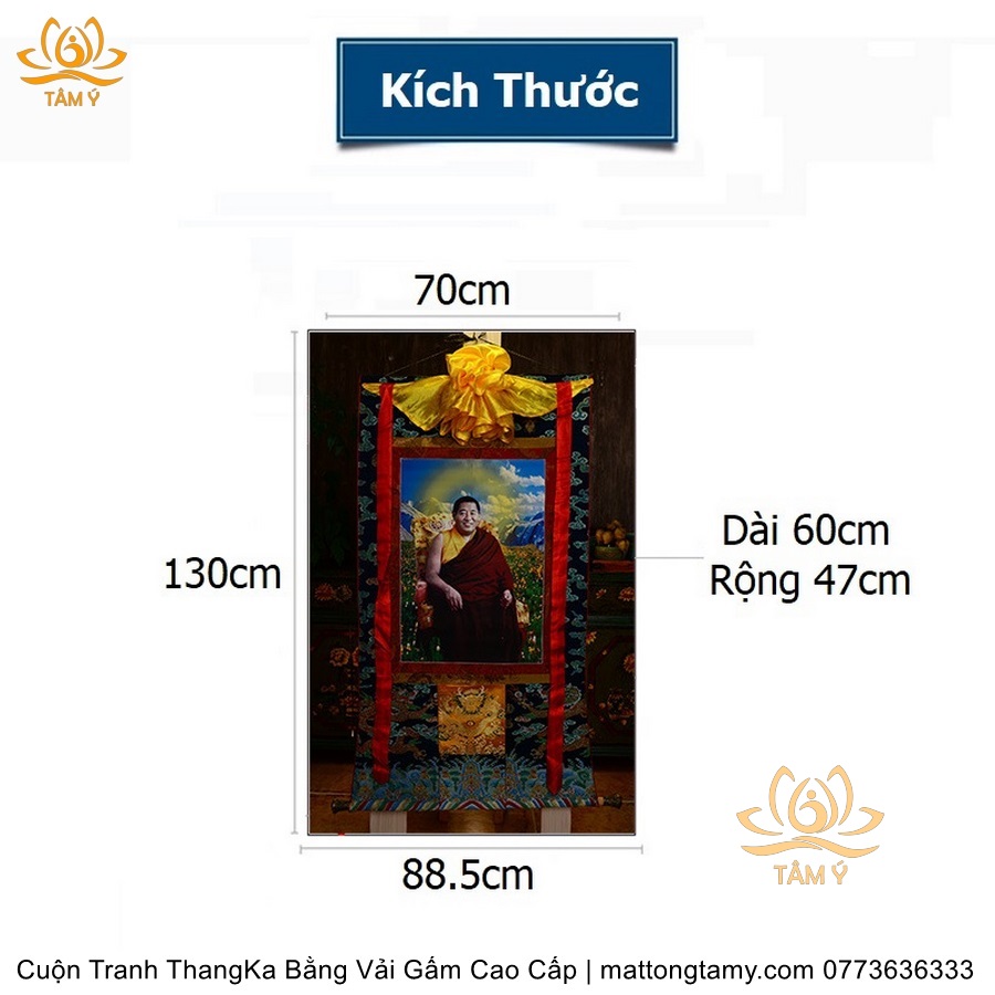 Chất liệu: Vải gấm cao cấp. In: Pháp Vương(Choeje) Jigme Phuntsok. Kích thước: dài: 130cm, rộng phía trên: 64cm, rộng phía dưới: 84cm. Tranh vẽ máy nhiều lớp công nghệ cao rất sắc nét, màu sắc tươi sáng, độ hoàn mỹ xuất sắc. Tranh vẽ máy trên lụa, rồi may lên khung bằng vải gấm, 2 đầu tranh là thanh gỗ quý.