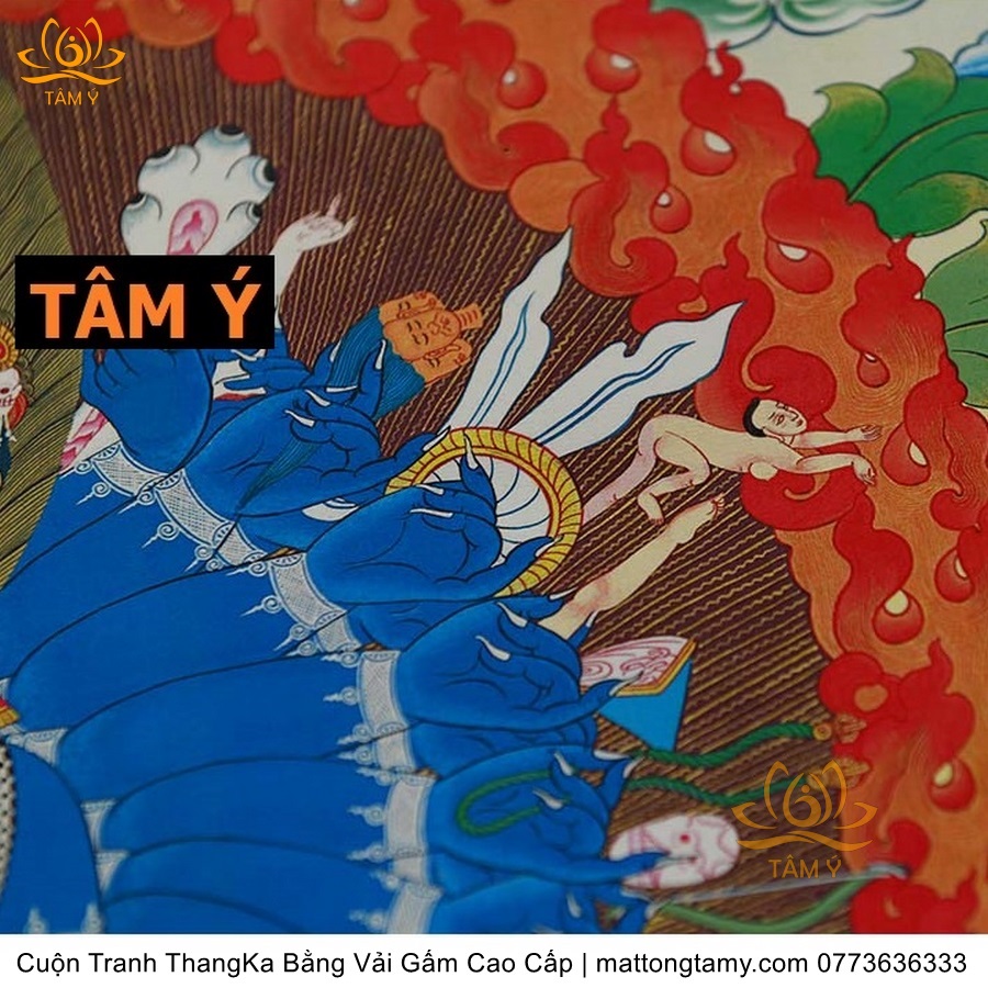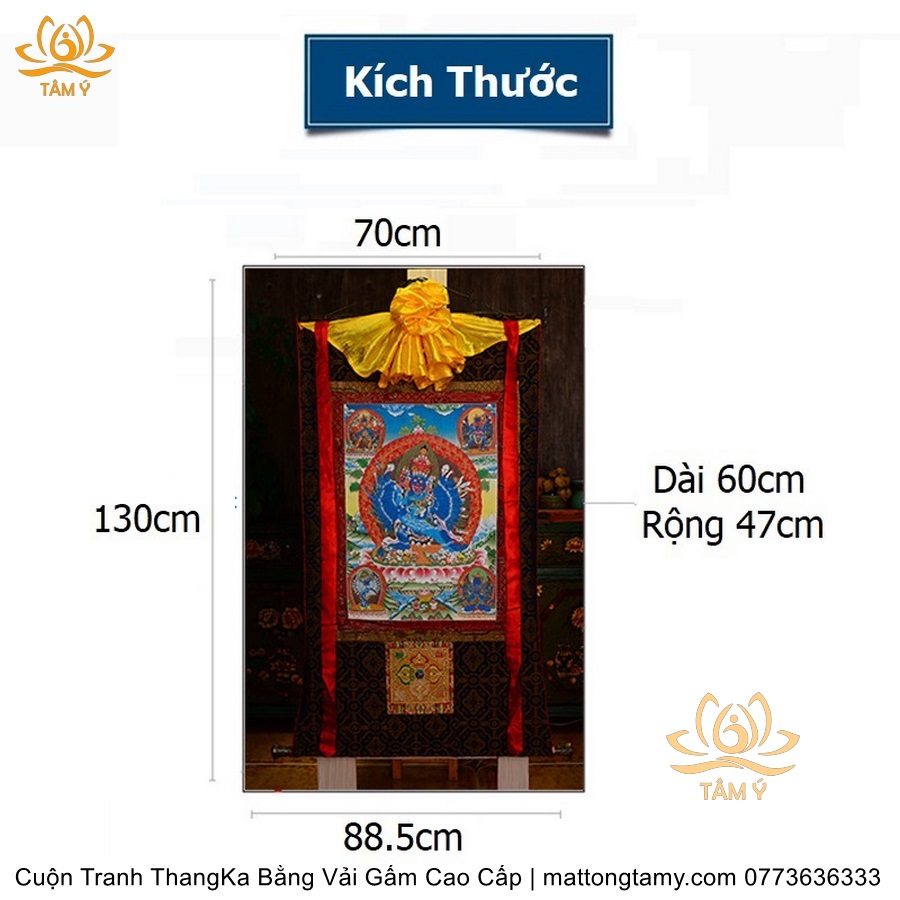Chất liệu: Vải gấm cao cấp. Thêu: Ngài Yamataka Đại Uy Đức Minh Vương. Kích thước: dài: 130cm, rộng phía trên: 70cm, rộng phía dưới: 88.5cm. Tranh vẽ máy nhiều lớp công nghệ cao rất sắc nét, màu sắc tươi sáng, độ hoàn mỹ xuất sắc. Tranh vẽ máy trên lụa, rồi may lên khung bằng vải gấm, 2 đầu tranh là thanh gỗ quý.