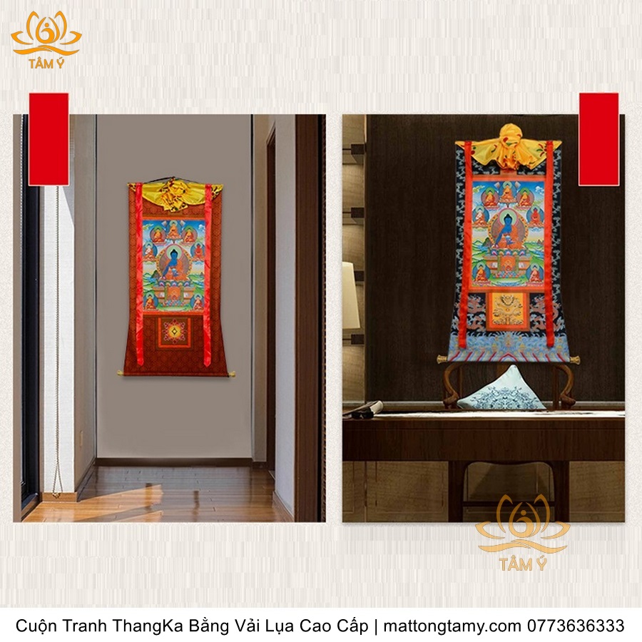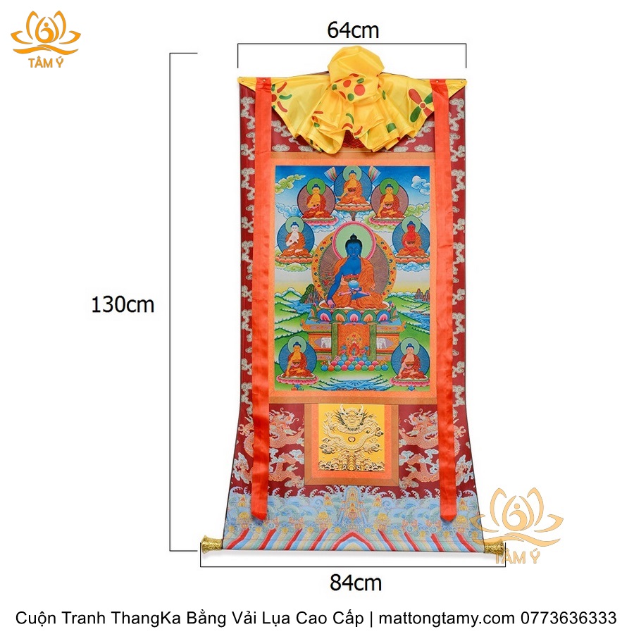 Chất liệu: Vải gấm cao cấp. Thêu: Dược Sư Phật. Kích thước: dài: 130cm, rộng phía trên: 64cm, rộng phía dưới: 84cm. Tranh vẽ máy nhiều lớp công nghệ cao rất sắc nét, màu sắc tươi sáng, độ hoàn mỹ xuất sắc. Tranh vẽ máy trên lụa, rồi may lên khung bằng vải gấm, 2 đầu tranh là thanh gỗ quý.