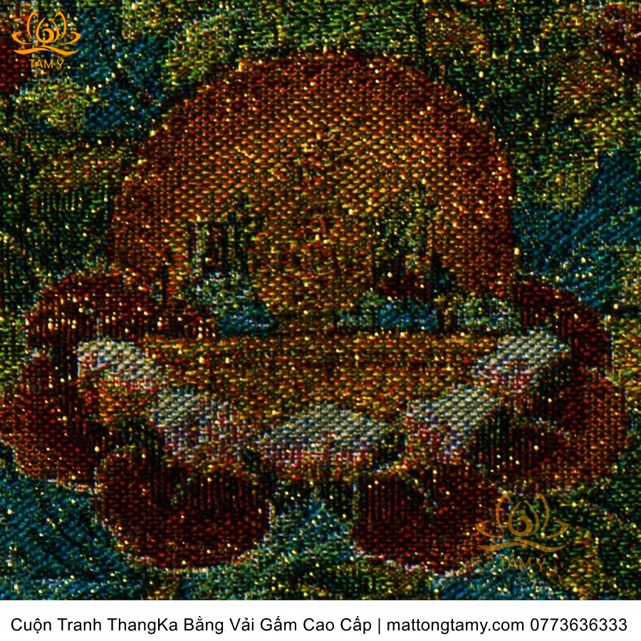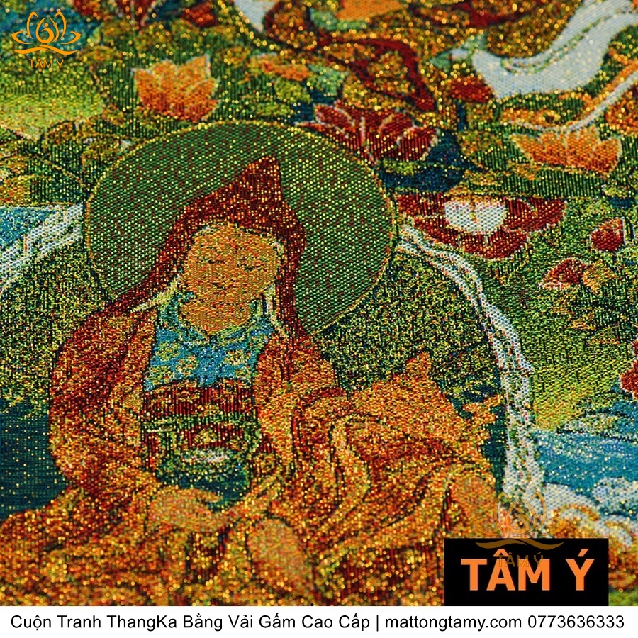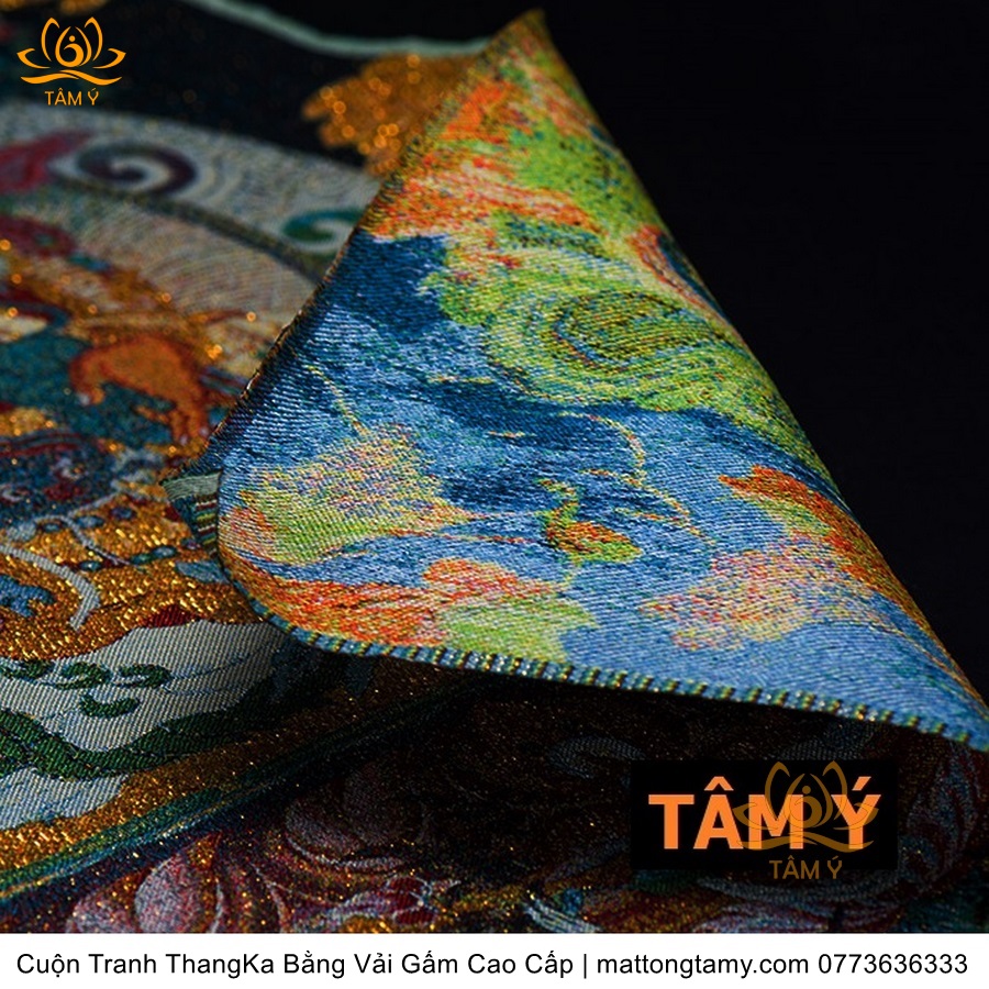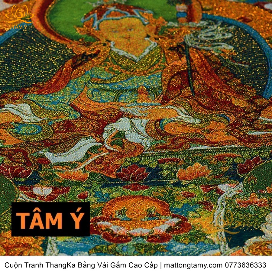 Chất liệu: Vải gấm cao cấp. Thêu dệt hình tướng: Liên Hoa Sinh. Kích thước: dài: 200cm, rộng phía trên: 120cm, rộng phía dưới: 140cm. Tranh thêu xong sẽ được may lên khung bằng vải gấm, 2 đầu tranh là thanh gỗ quý.
