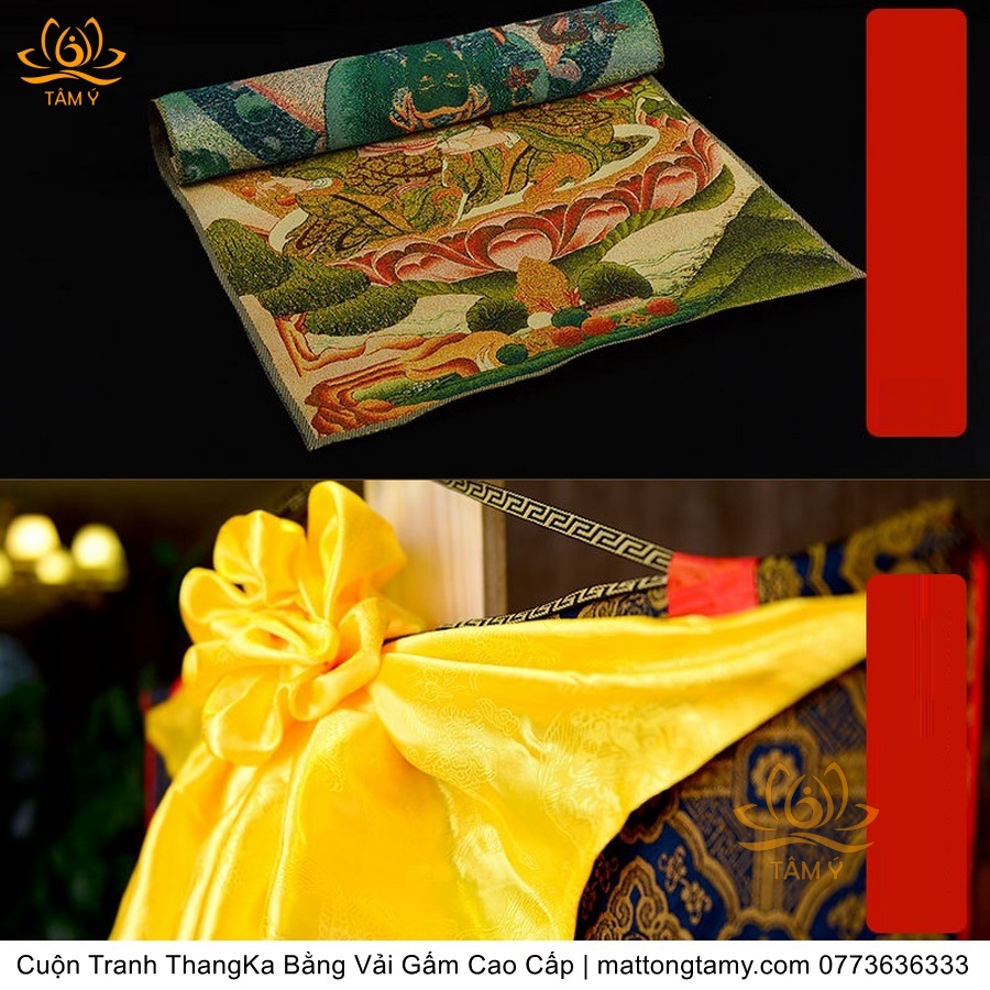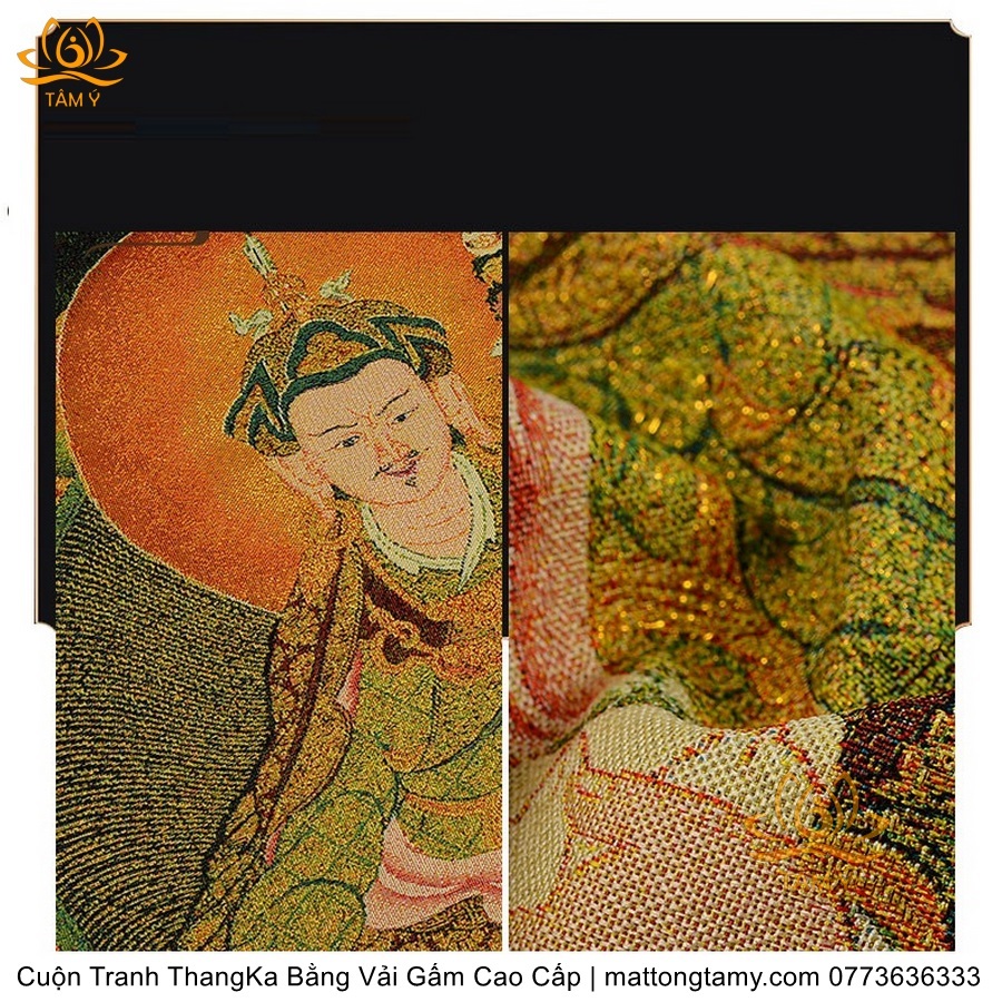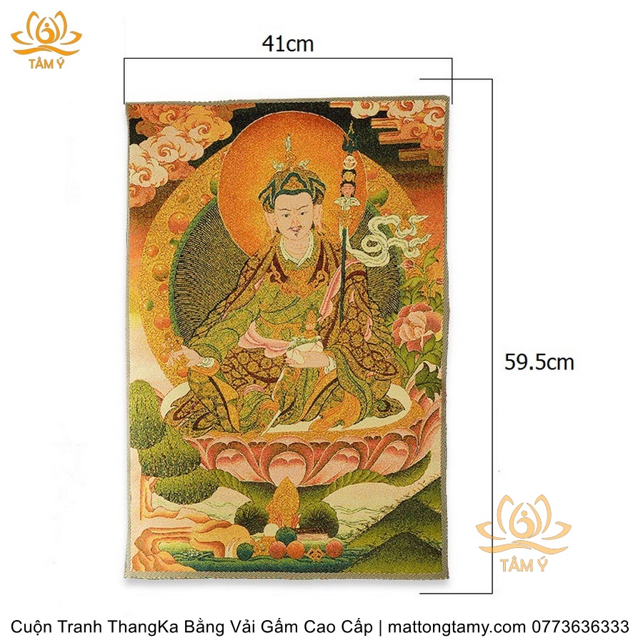 Chất liệu: Vải gấm cao cấp. Thêu dệt hình tướng: Liên Hoa Sinh. Kích thước: dài: 130cm, rộng phía trên: 70cm, rộng phía dưới: 88.5cm. Tranh thêu xong sẽ được may lên khung bằng vải gấm, 2 đầu tranh là thanh gỗ quý.