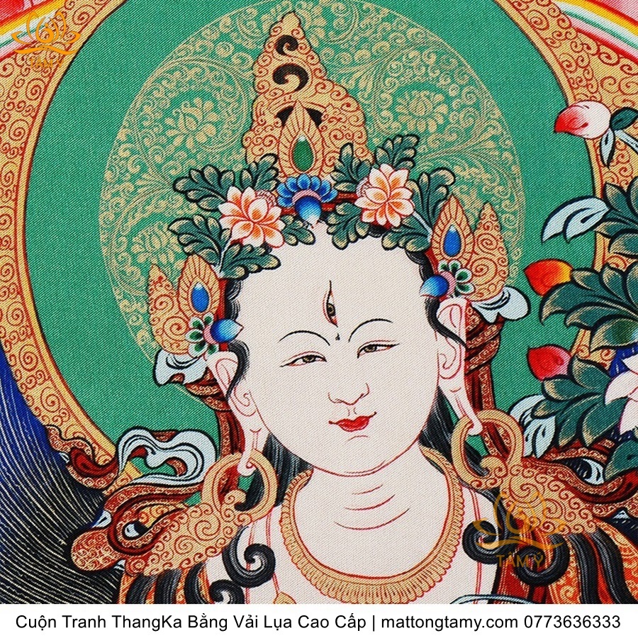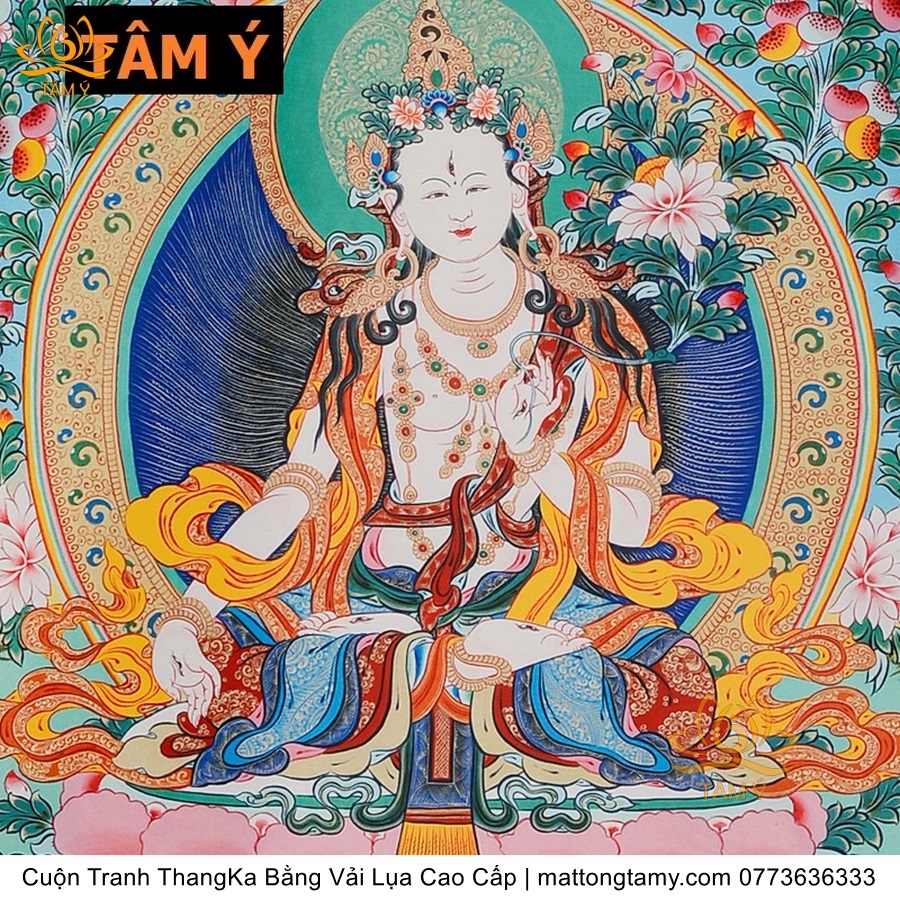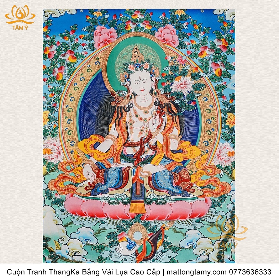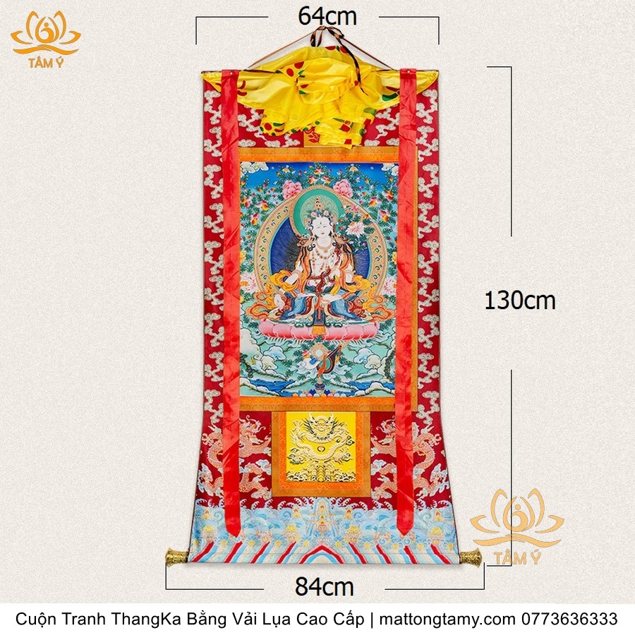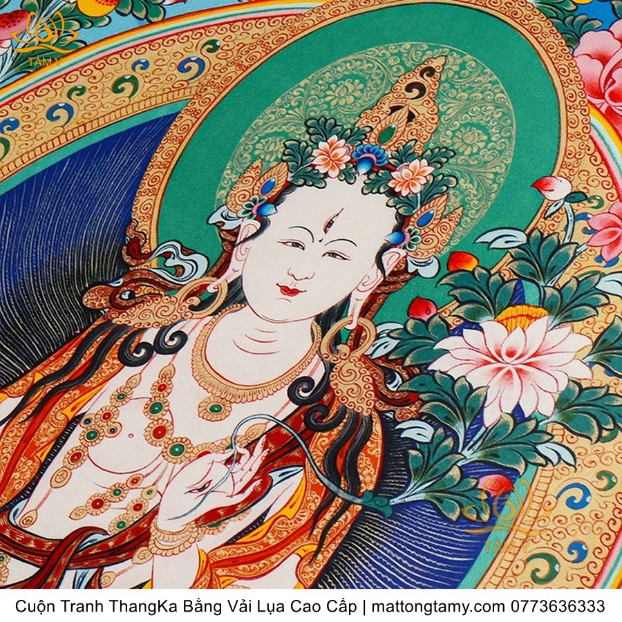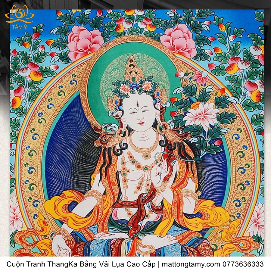 Cuộn Tranh ThangKa Phật Tara Trắng Bằng Vải Gấm Cao Cấp, Kiểu 2, TCT51