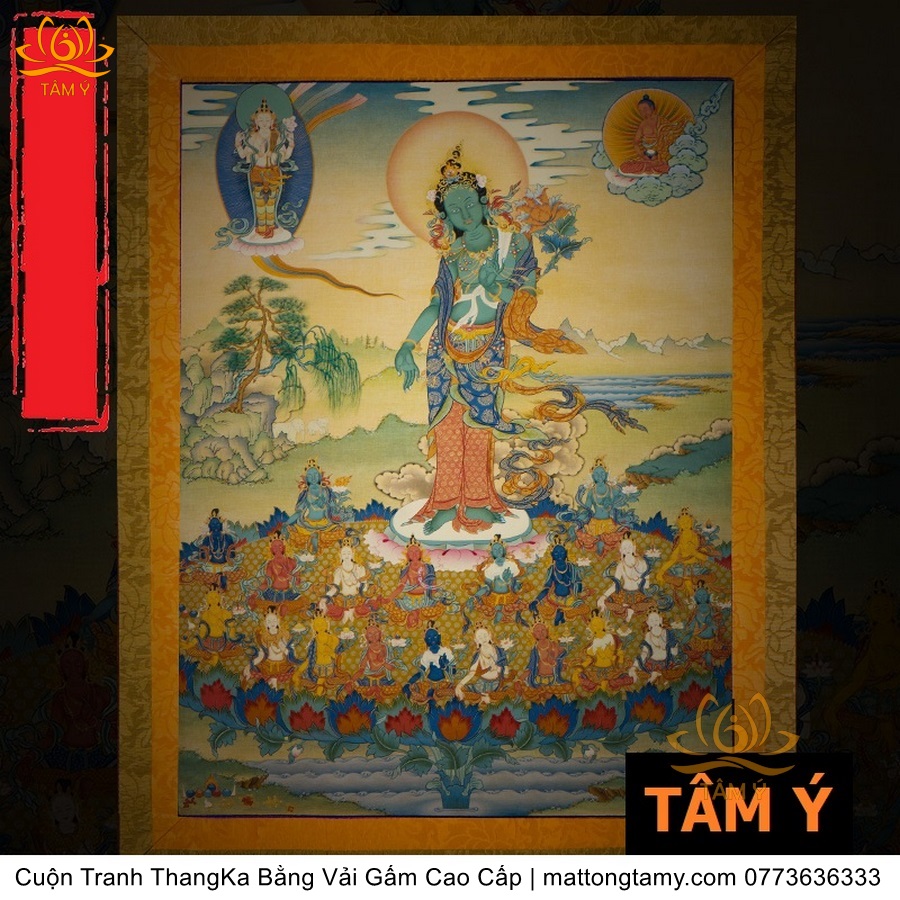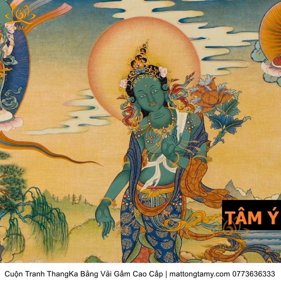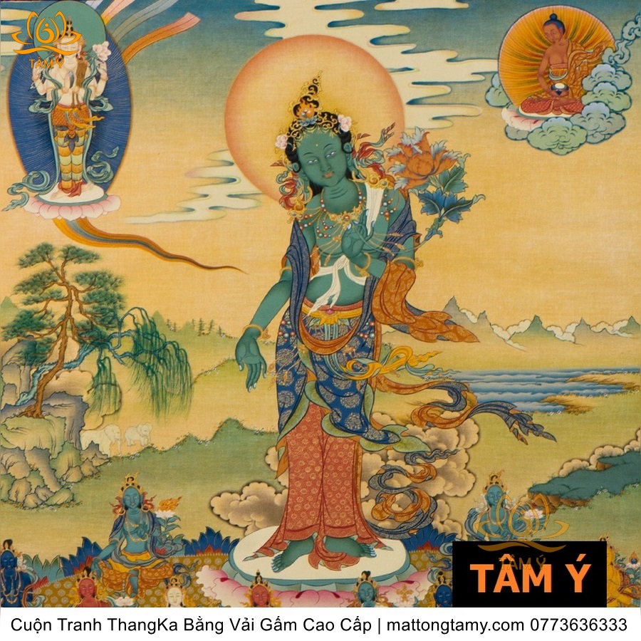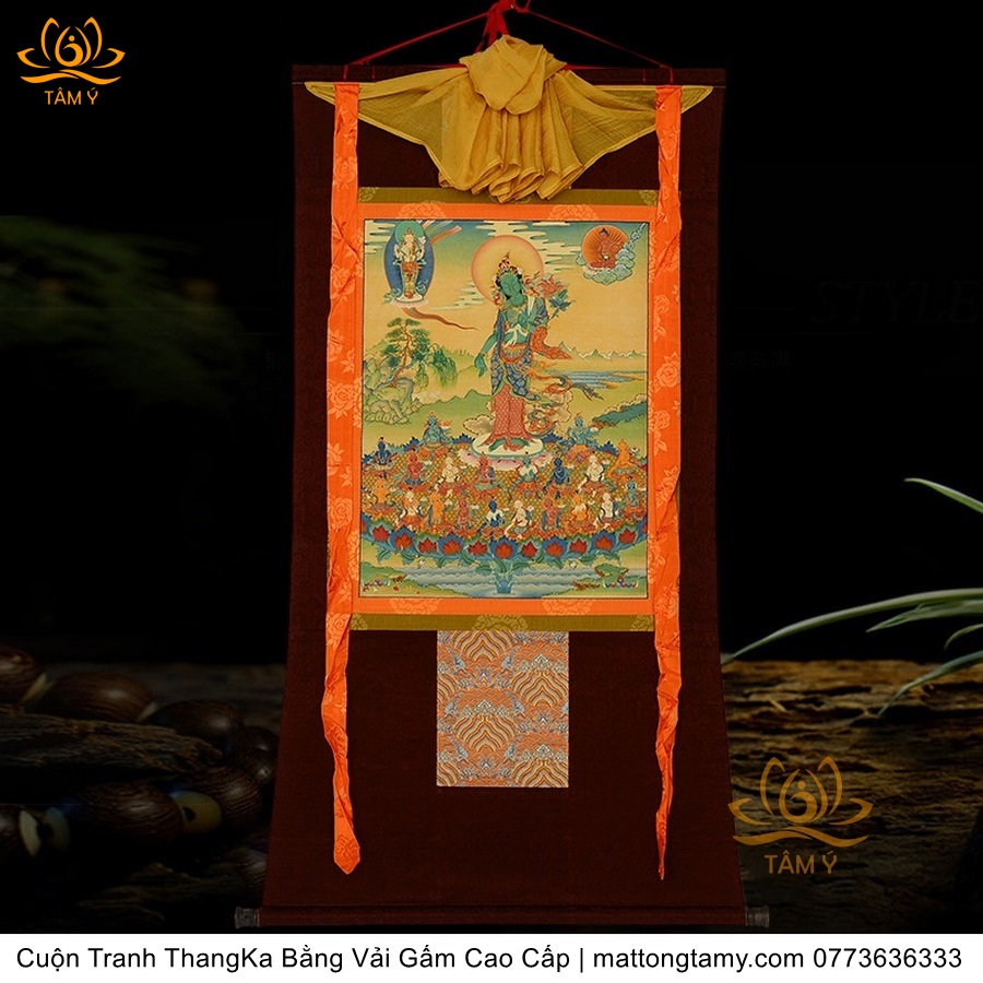 Cuộn Tranh ThangKa Phật Tara Xanh Lục Độ Phật Mẫu Bằng Vải Gấm Cao Cấp, Kiểu 3, TCT10