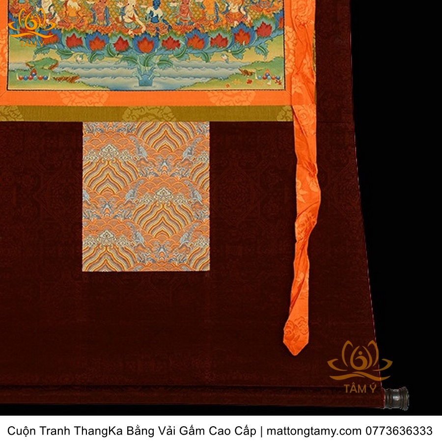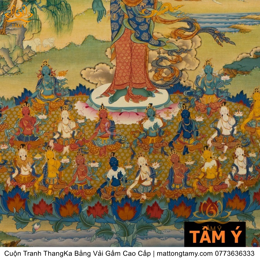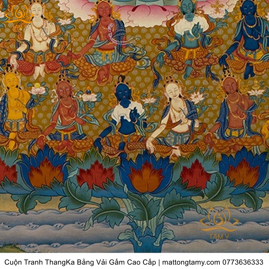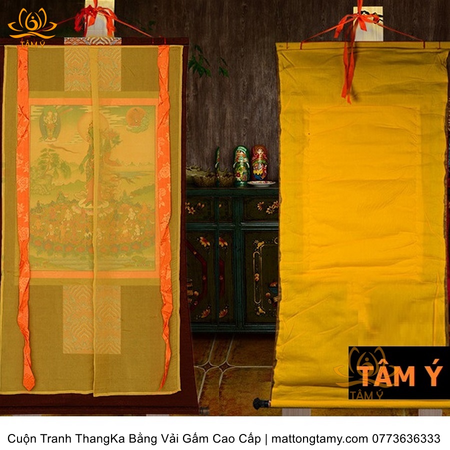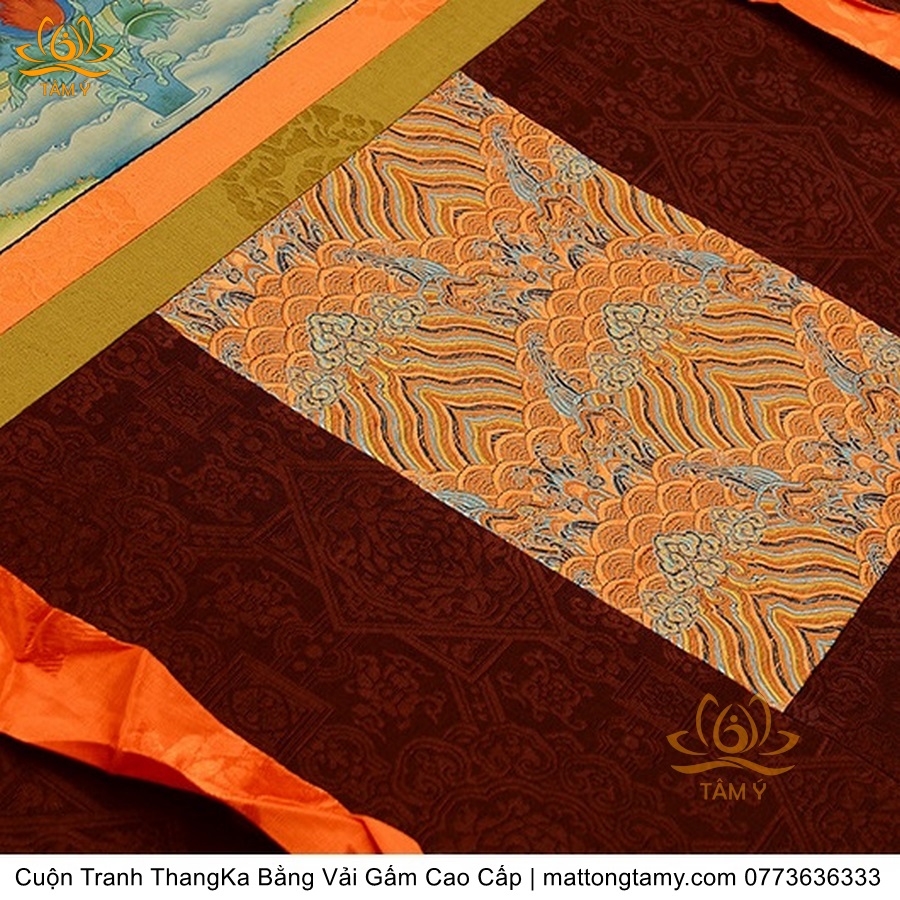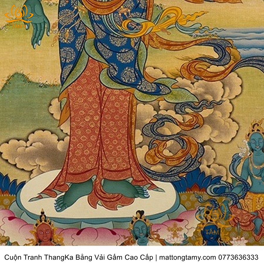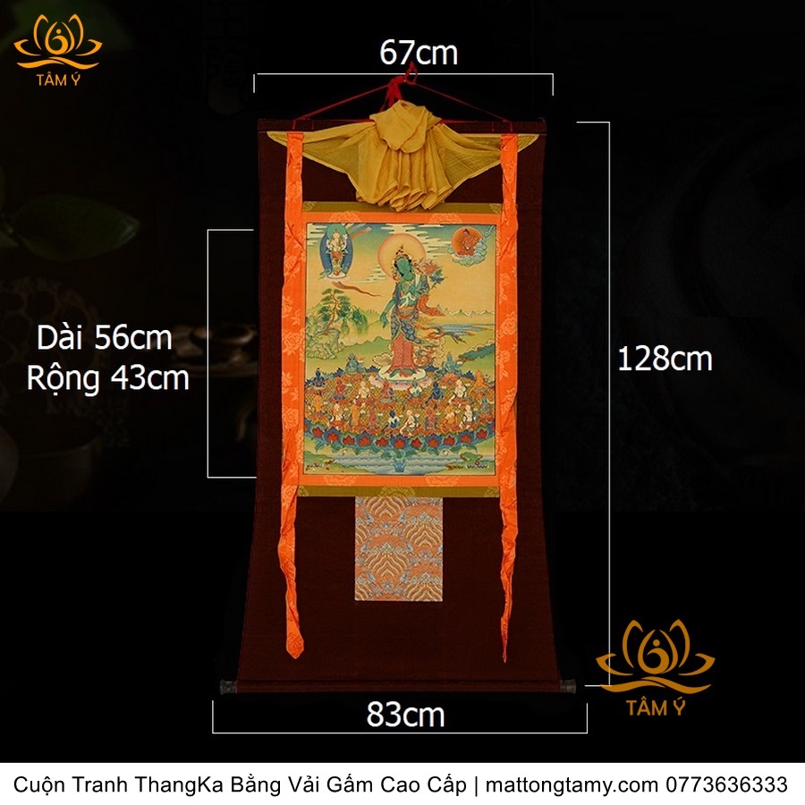 Chất liệu: Vải gấm cao cấp. In: Phật Tara Xanh, Lục Độ Phật Mẫu. Kích thước: dài: 139cm, rộng phía trên: 66.5cm, rộng phía dưới: 83cm. Tranh vẽ máy nhiều lớp công nghệ cao rất sắc nét, màu sắc tươi sáng, độ hoàn mỹ xuất sắc. Tranh vẽ máy trên lụa, rồi may lên khung bằng vải gấm, 2 đầu tranh là thanh gỗ quý.