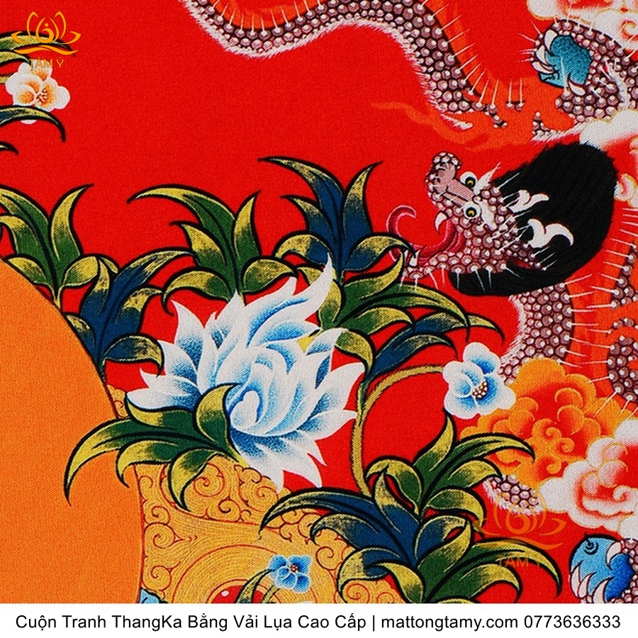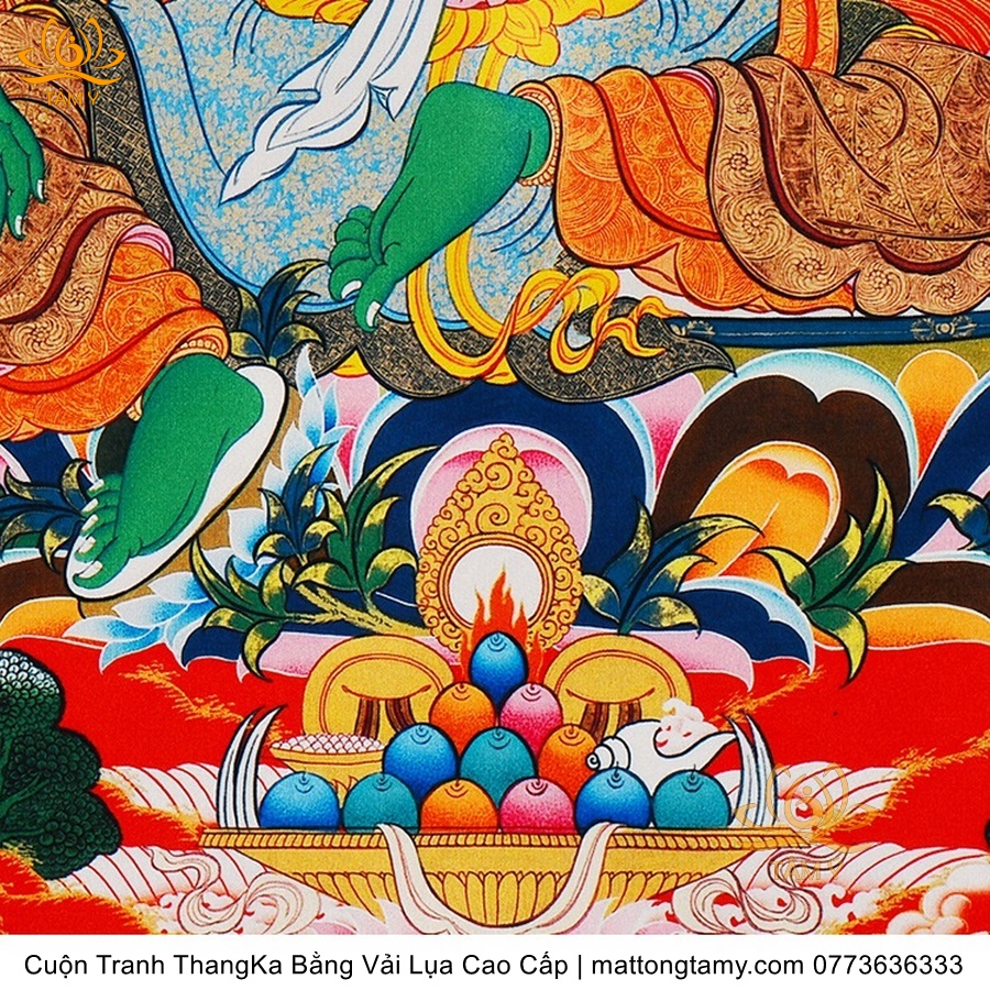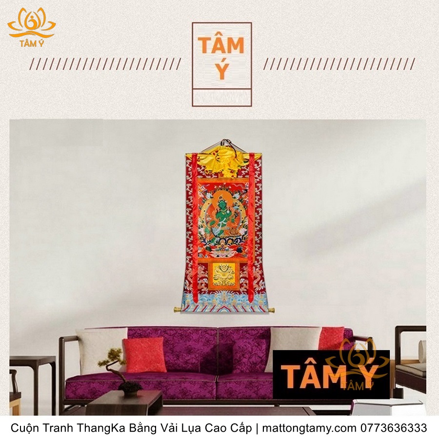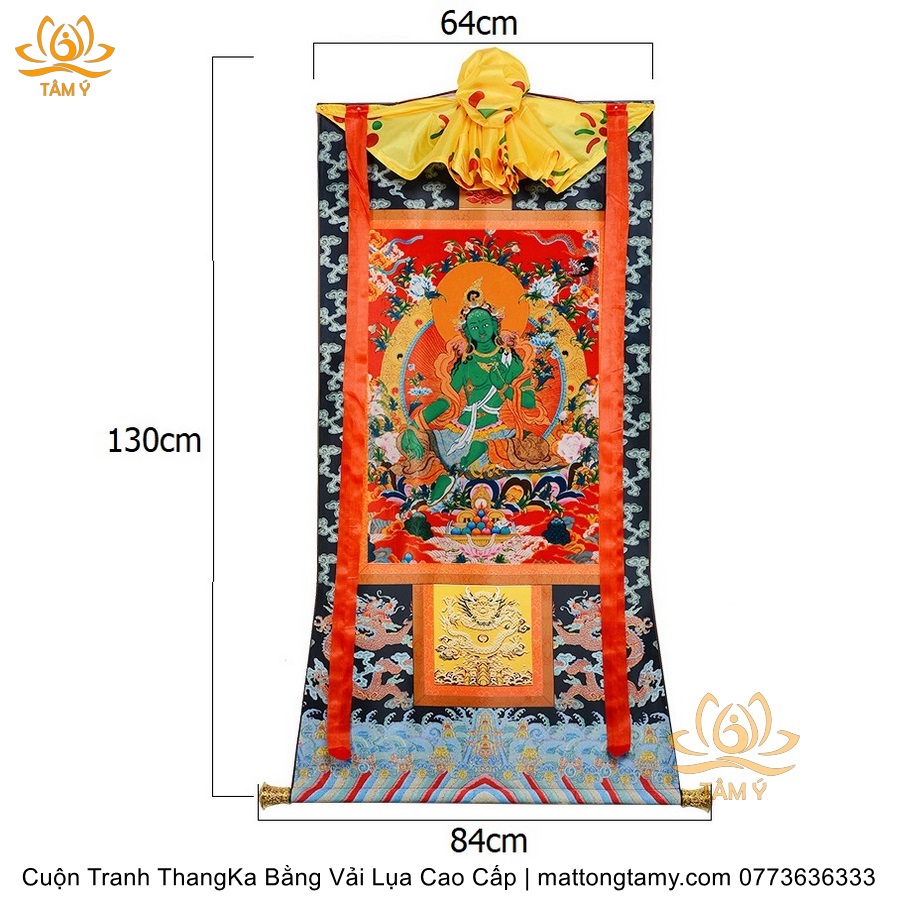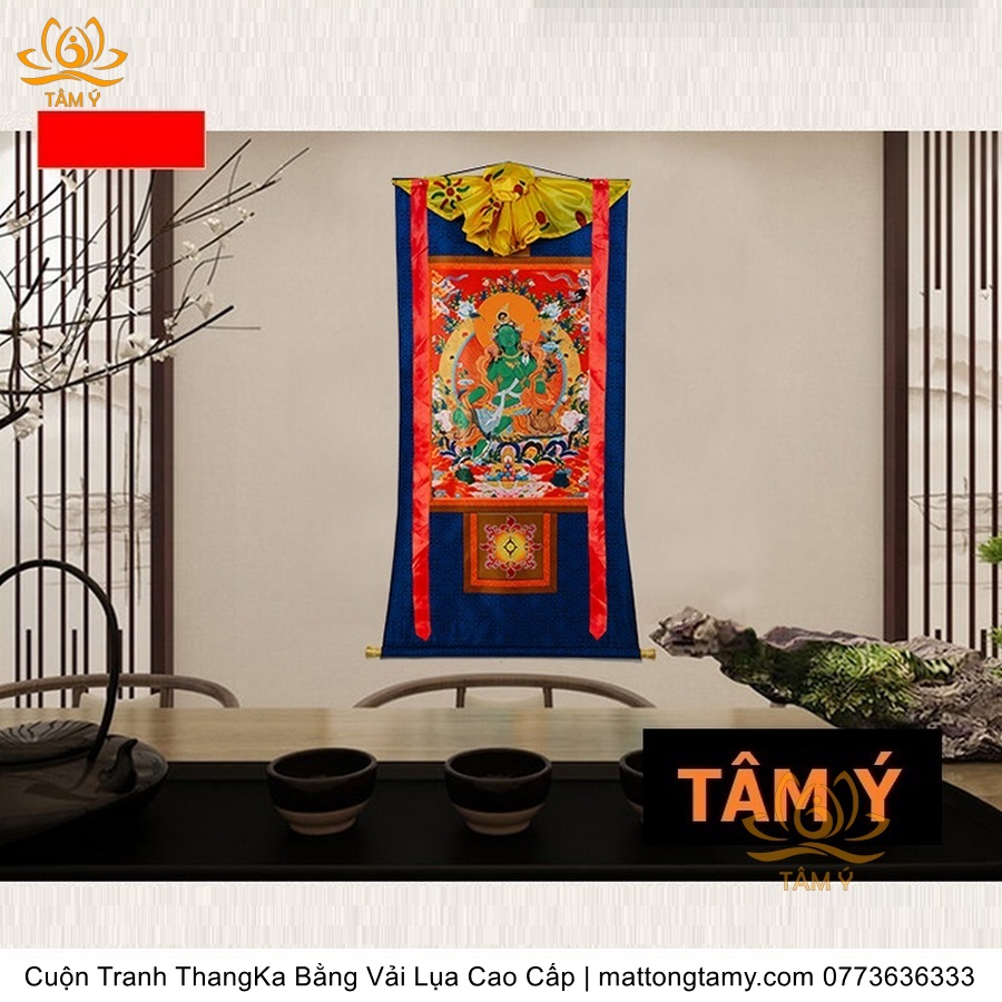 Chất liệu: Vải gấm cao cấp. In: Phật Tara Xanh, Lục Độ Phật Mẫu. Tranh vẽ máy nhiều lớp công nghệ cao rất sắc nét, màu sắc tươi sáng, độ hoàn mỹ xuất sắc. Kích thước: dài: 130cm, rộng phía trên: 70cm, rộng phía dưới: 88.5cm. Tranh vẽ máy trên lụa, rồi in(may) lên khung bằng vải gấm, 2 đầu tranh là thanh gỗ quý.