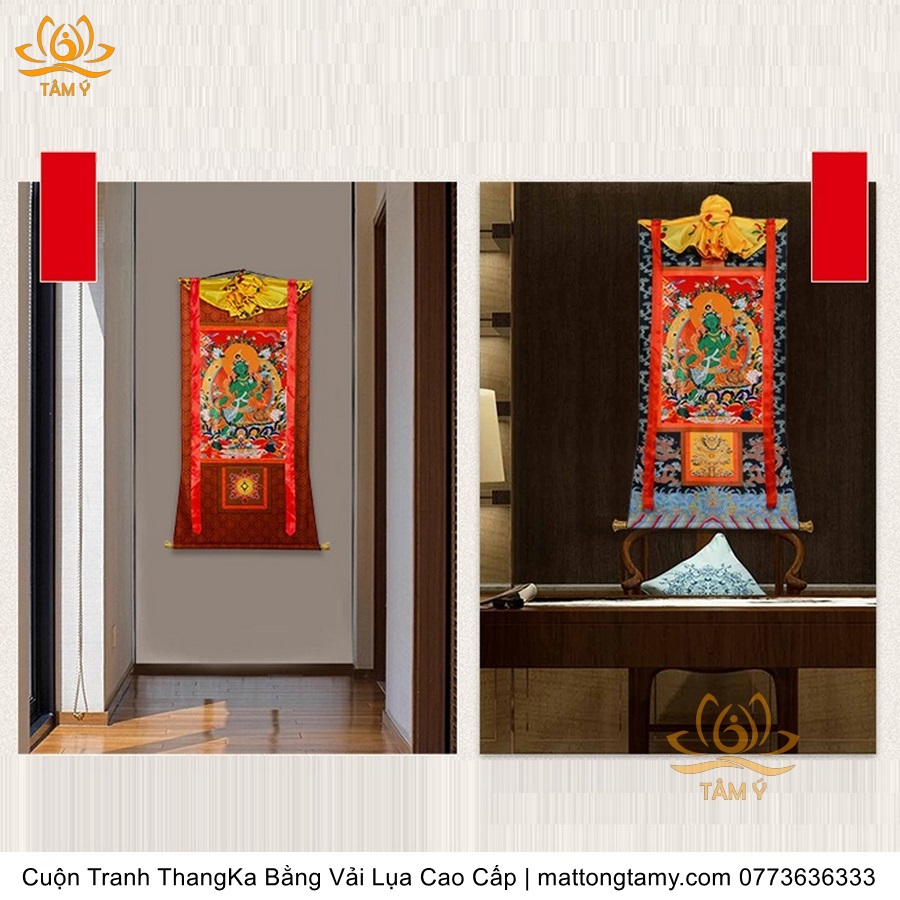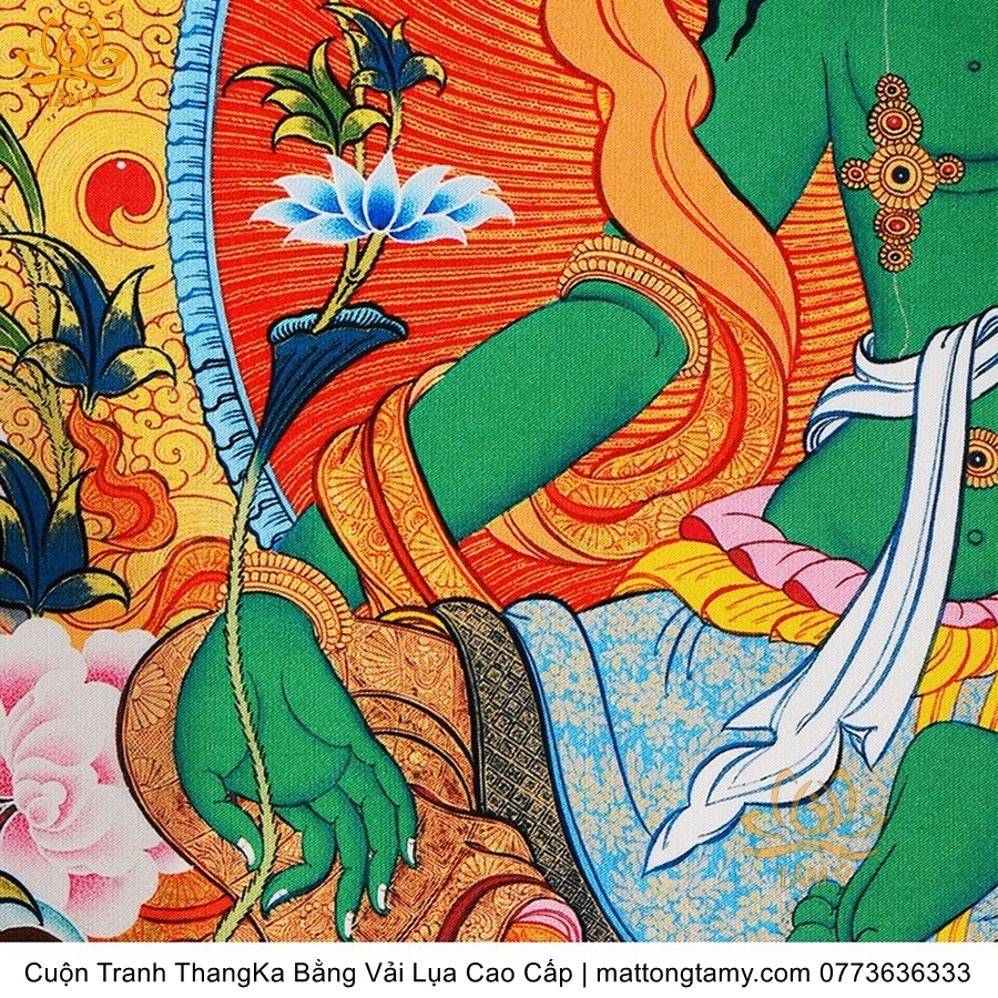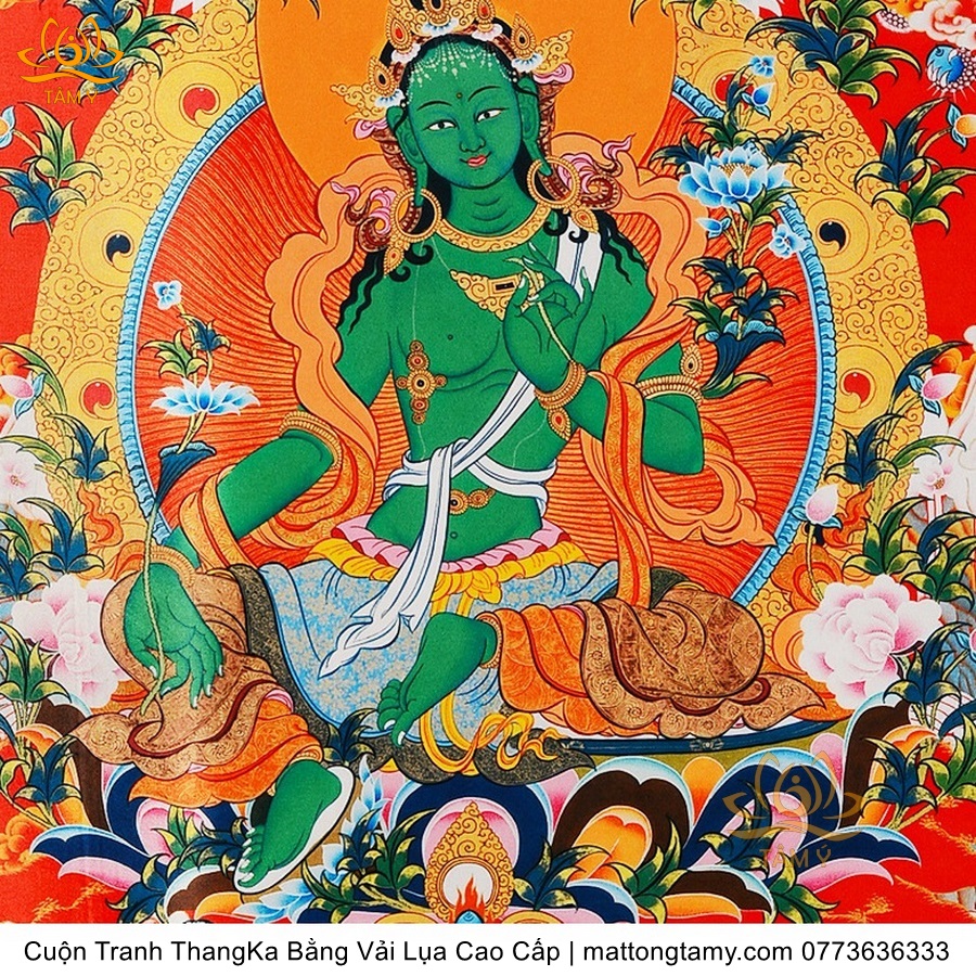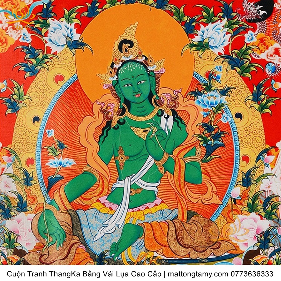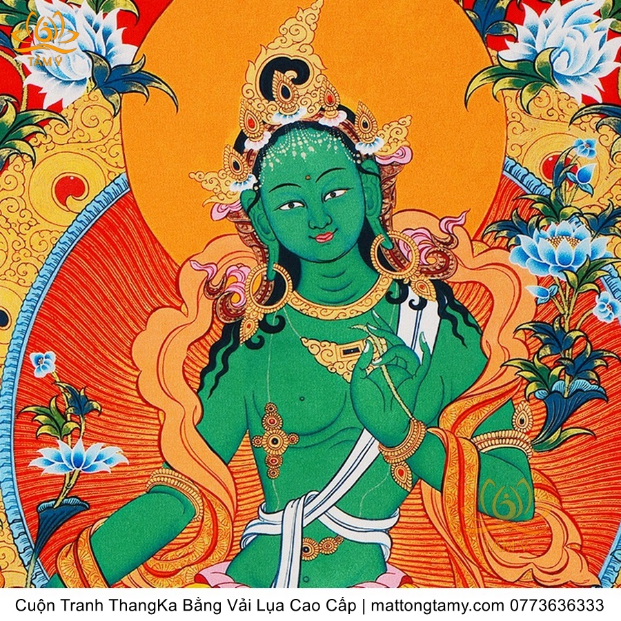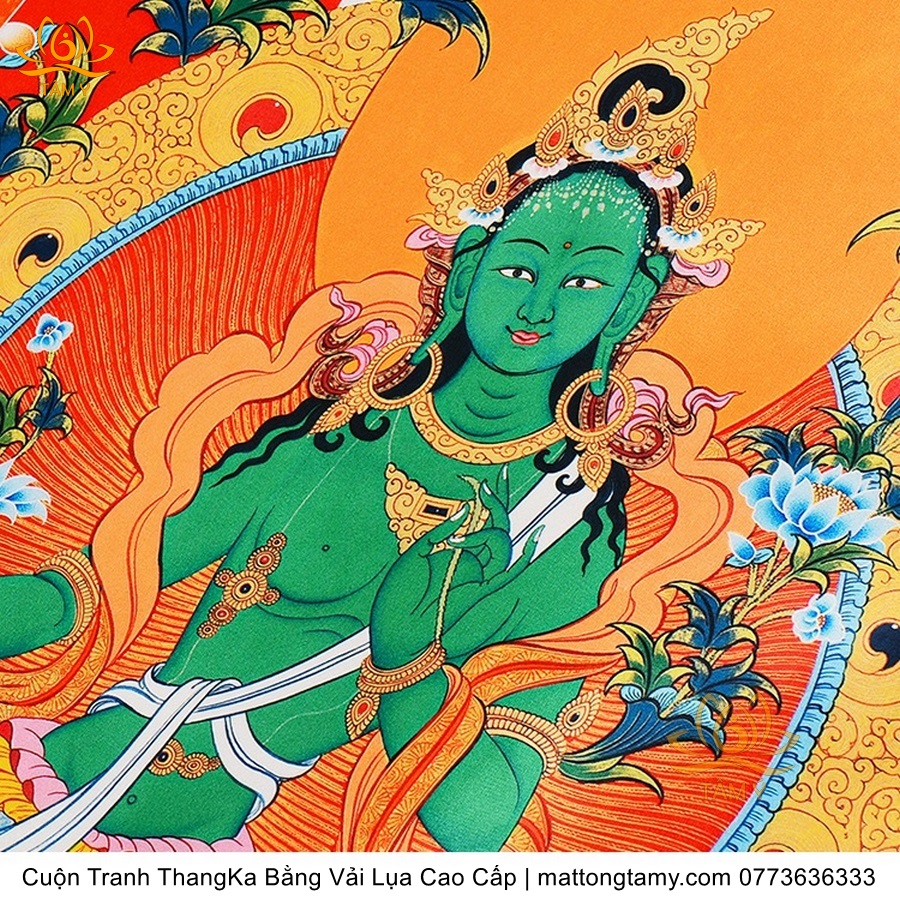 Cuộn Tranh ThangKa Phật Tara Xanh Lục Độ Phật Mẫu Bằng Vải Gấm Cao Cấp, Kiểu 6, TCT40