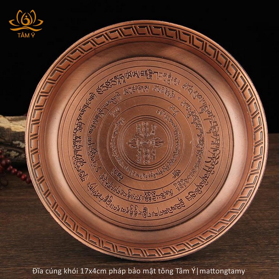 Ưu điểm: Đĩa được làm từ chất liệu hợp kim đồng, ở lòng đĩa khắc họa tiết lục đạo kim cang cùng các hoa văn nổi bật khác.