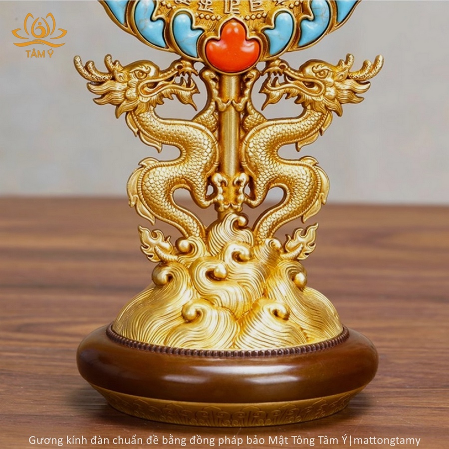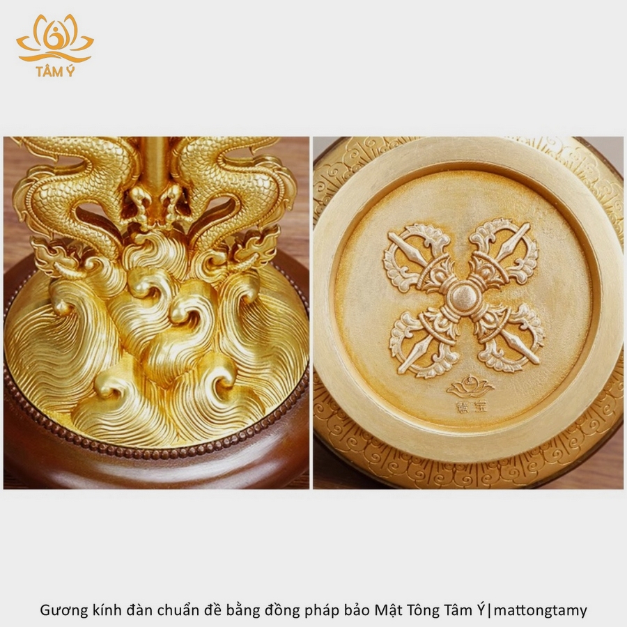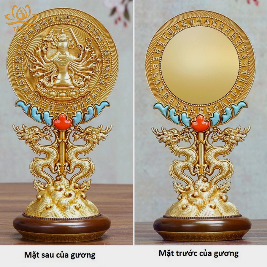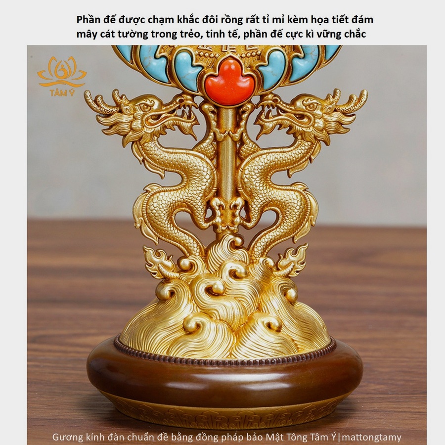 Ưu điểm: Gương chuẩn đề phật mẫu được thiết kế kèm chân đế, phần chân đế được chạm khắc đôi rồng kết hợp cùng các hoa văn khác tạo nên sự hài hòa. Phần gương tròn có thể tháo rời khỏi chân đế để thuận lợi khi di chuyển.