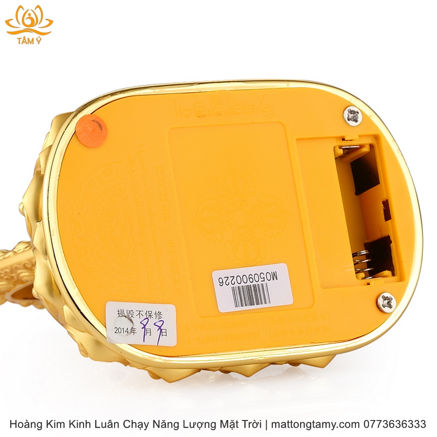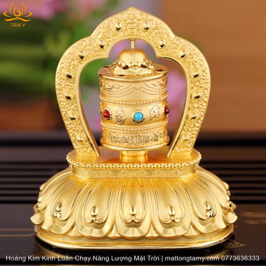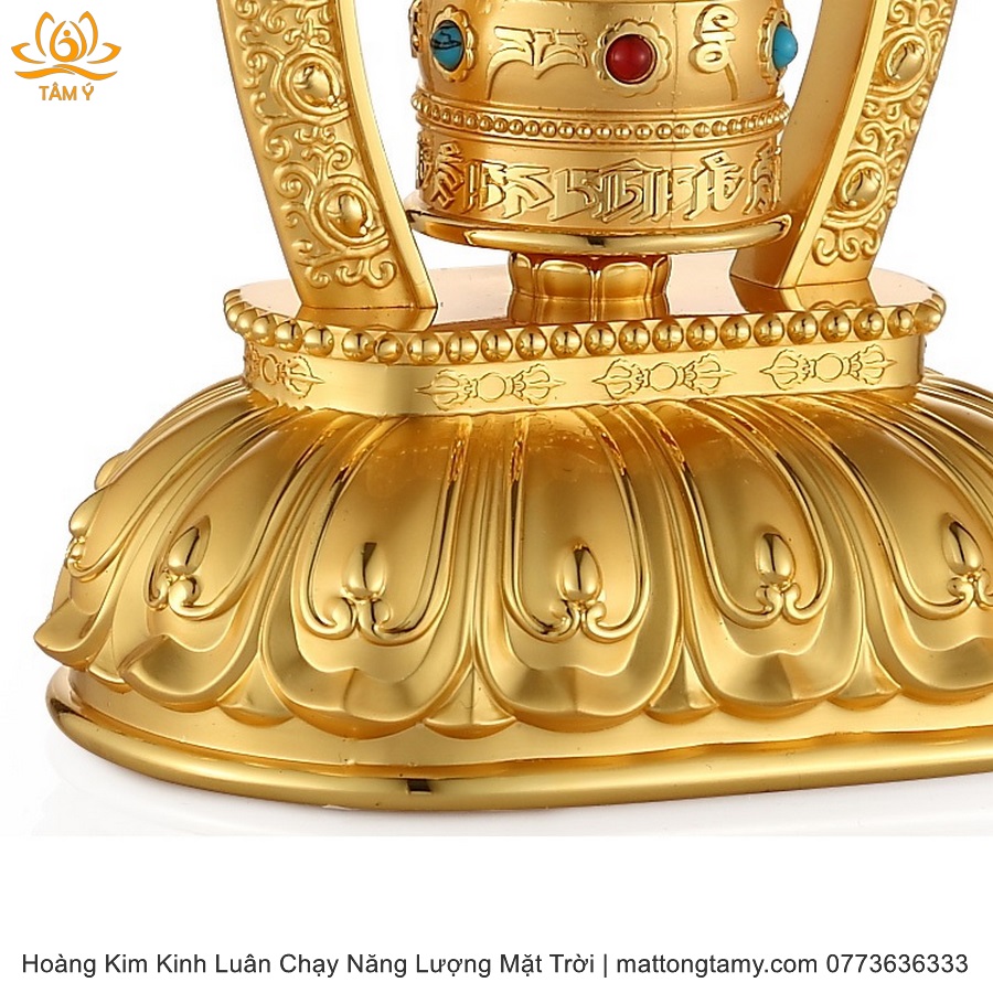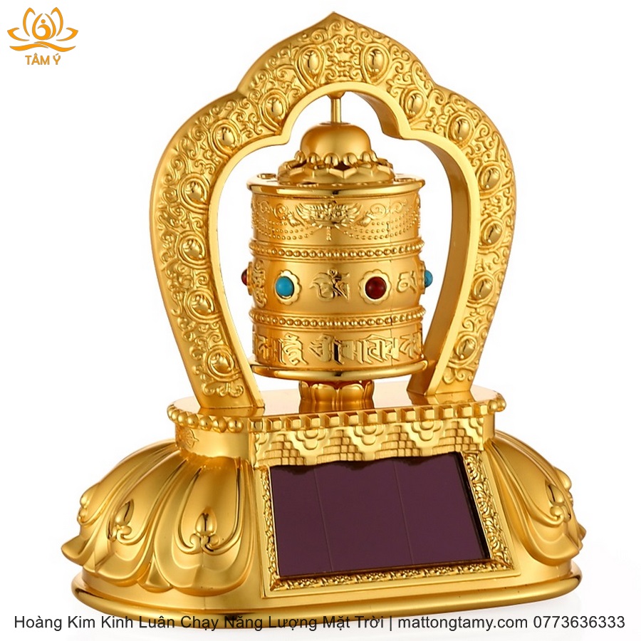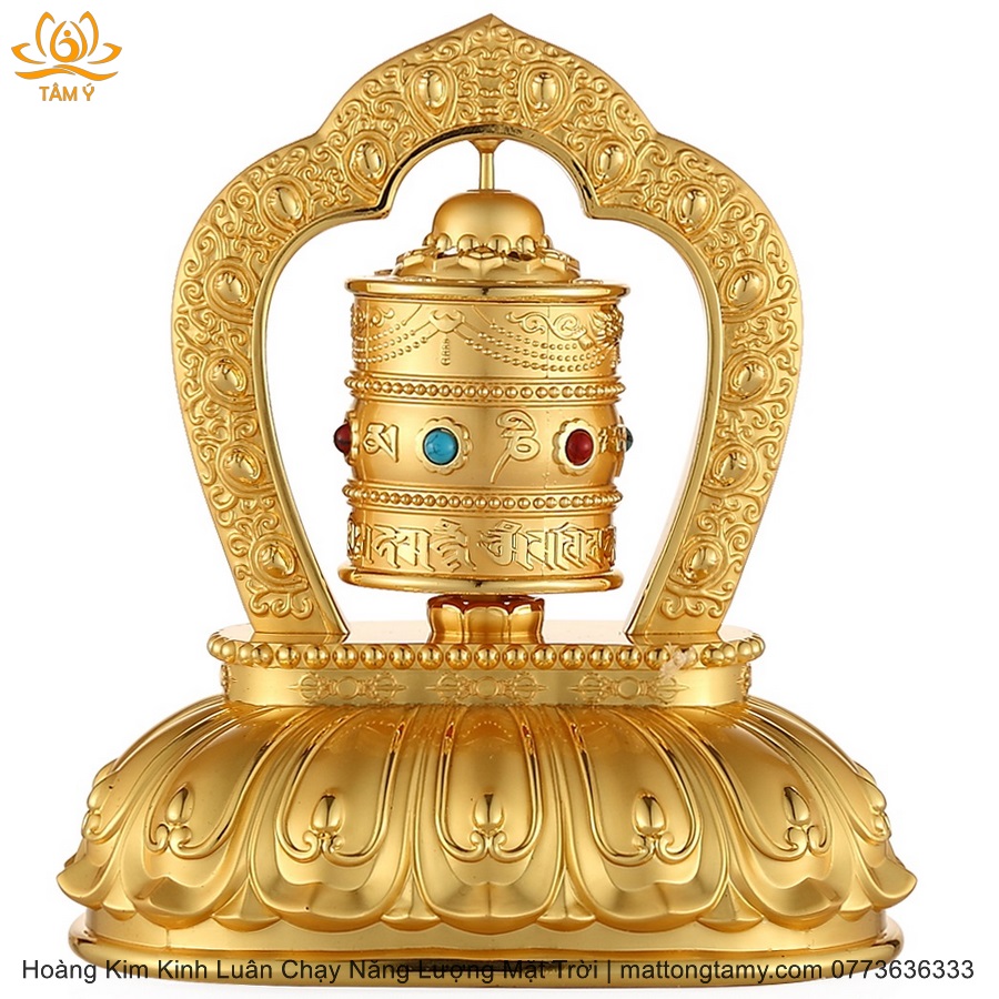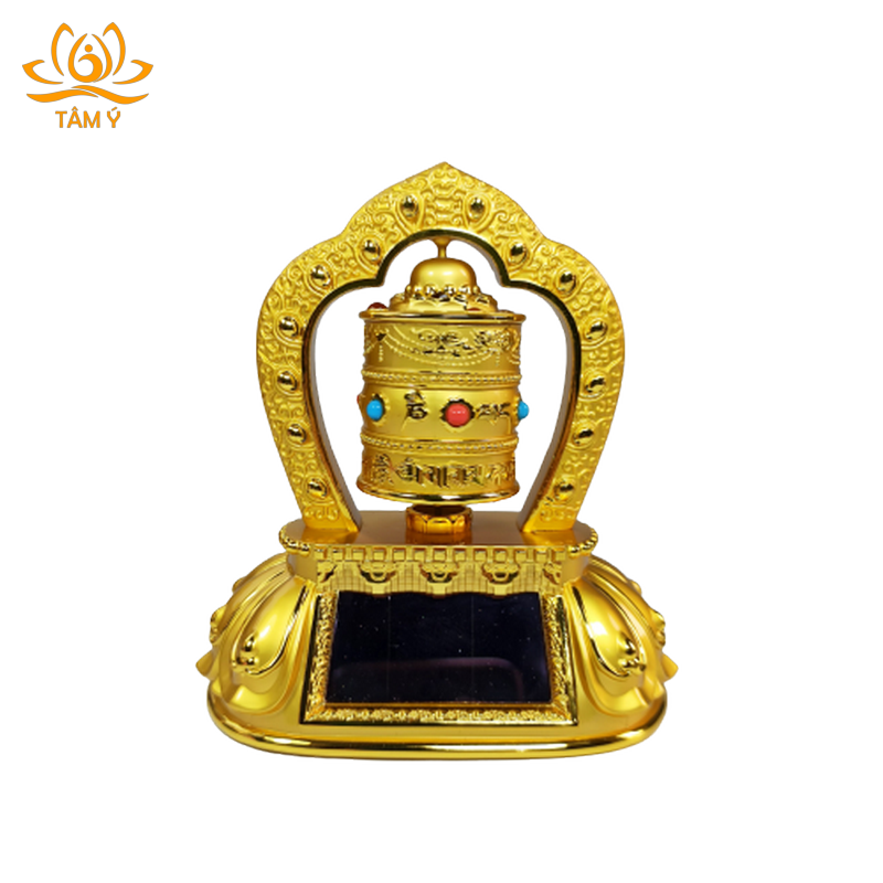 Chất liệu: Hợp kim nạm men ngọc. Kích thước ~12cmx9cmx7,5cm. Các biểu tượng: Ngọc báu mani, Thần thú bảo hộ (Rồng,Phượng), Lục tự đại minh. Sử dụng pin và miếng năng lượng mặt trời