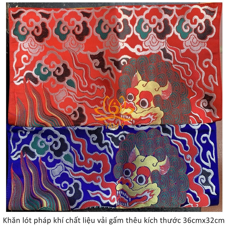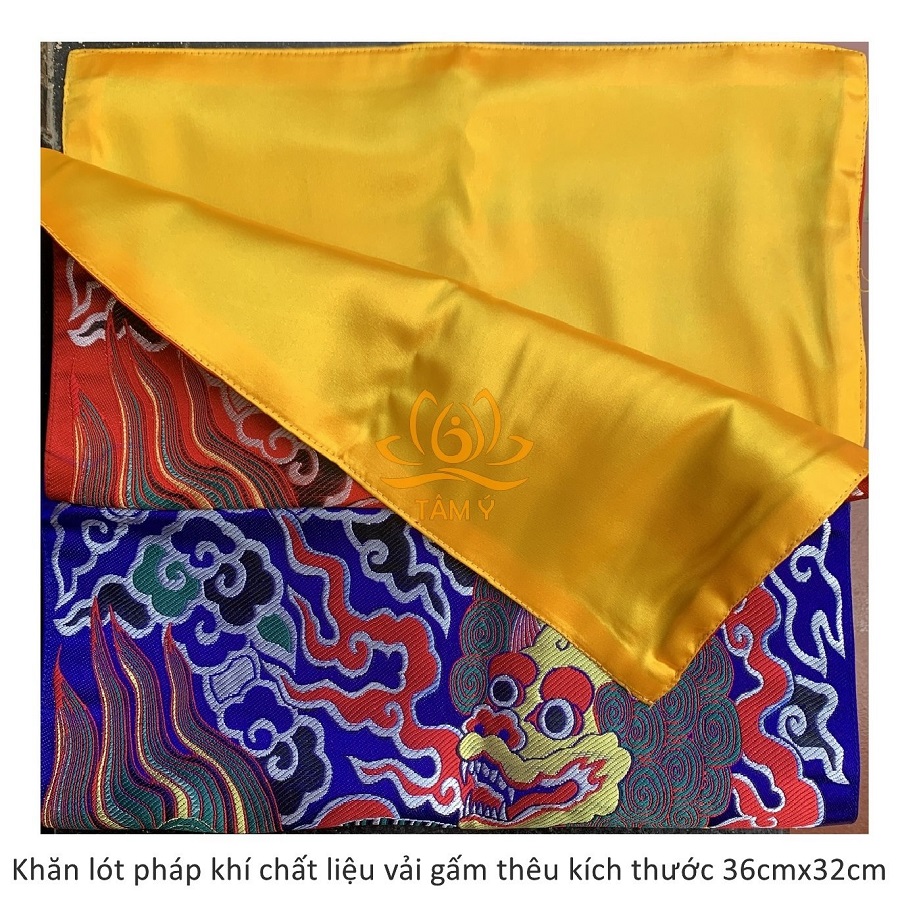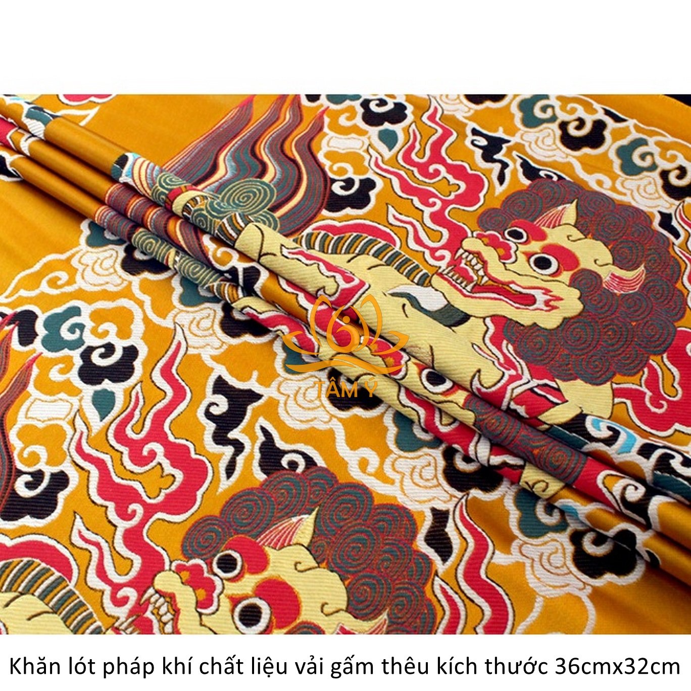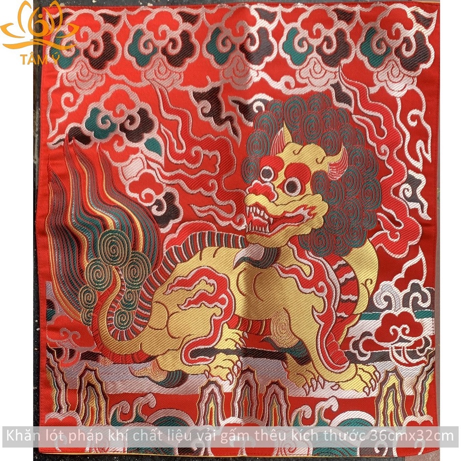 Khăn lót pháp khí chất liệu vải gấm thêu sư tử kích thước 36cm x 32cm