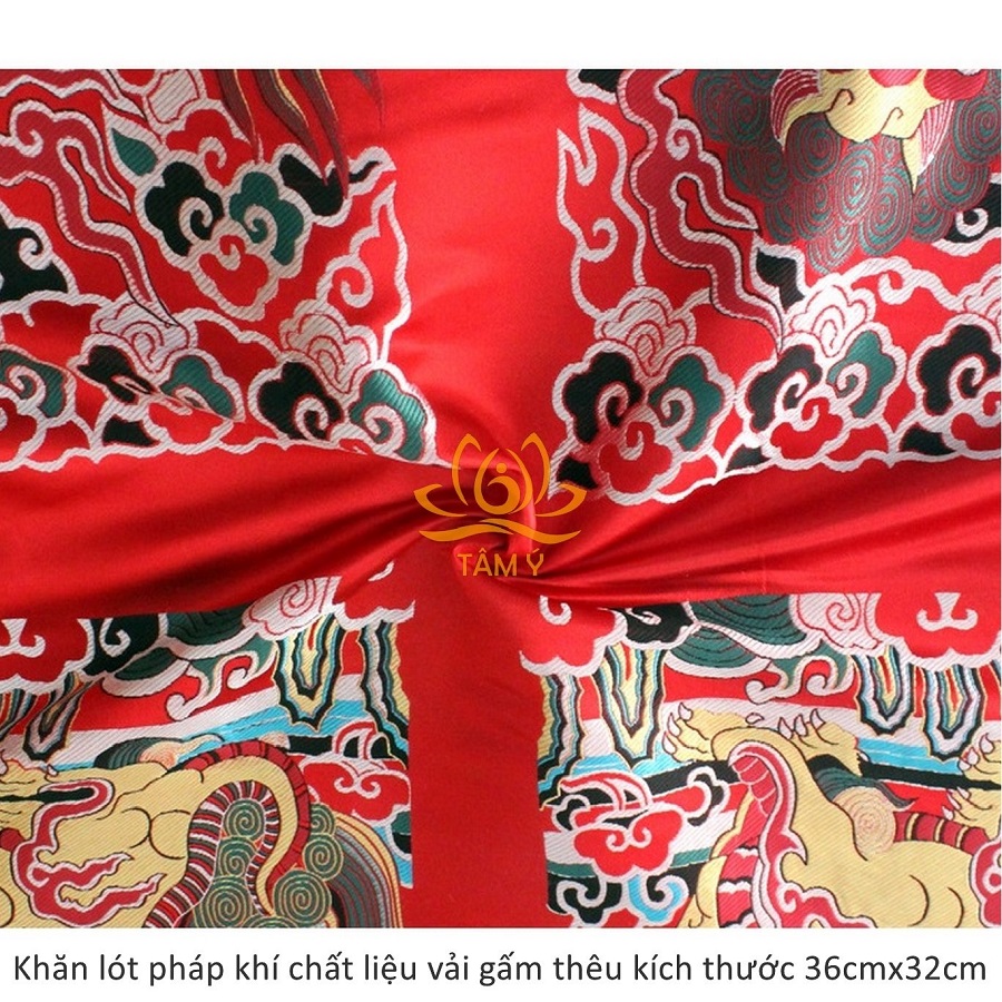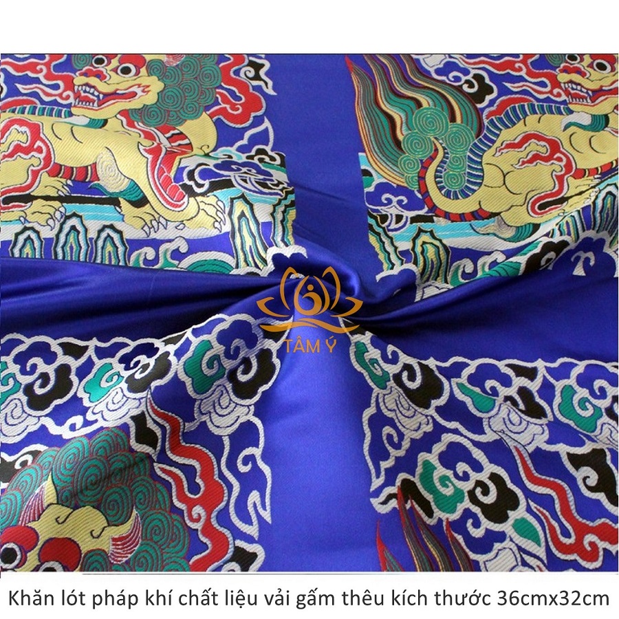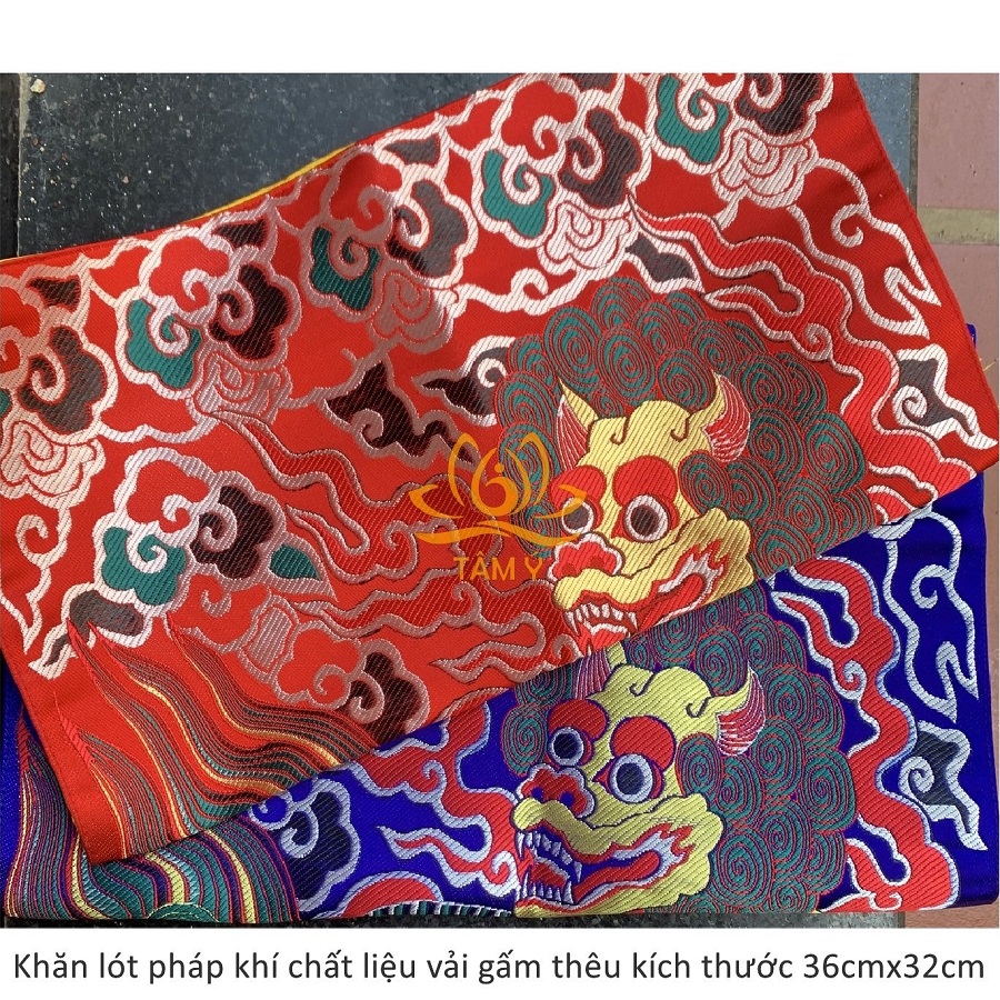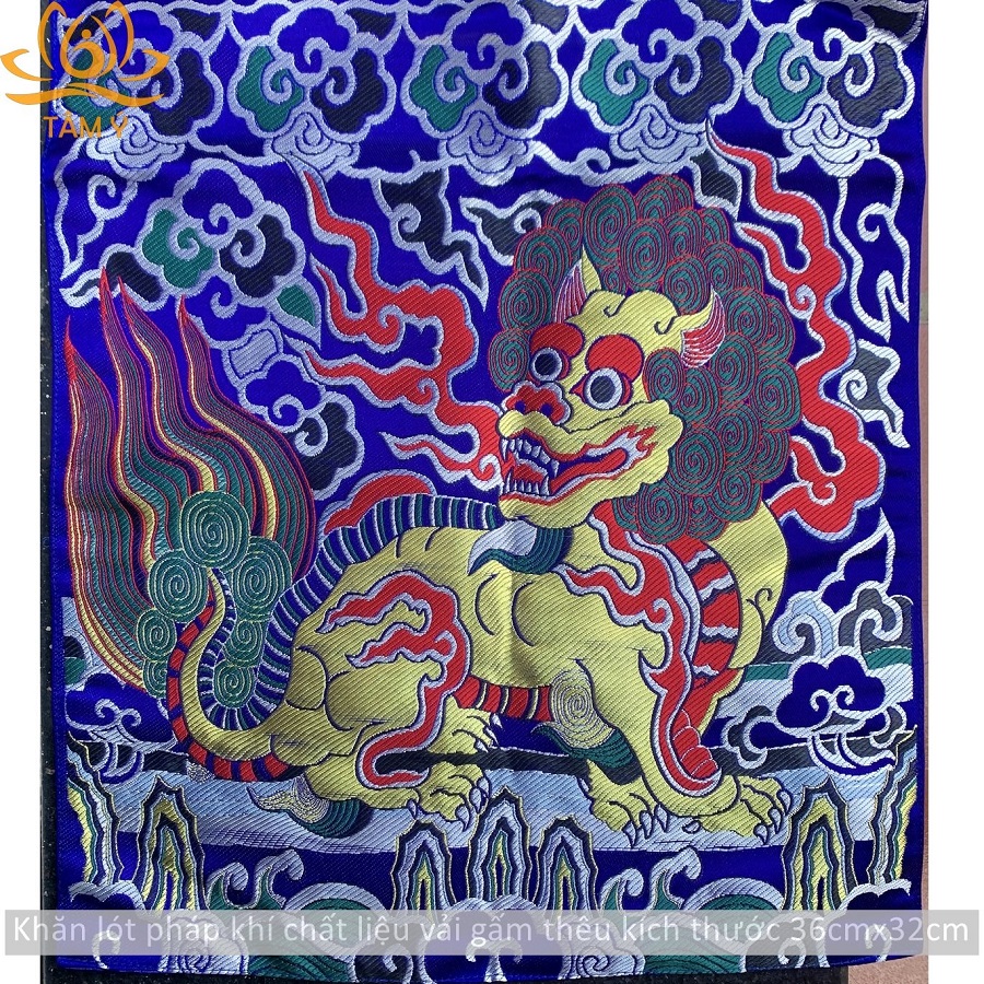 Khăn lót pháp khí chất liệu vải gấm thêu sư tử kích thước 36cm x 32cm