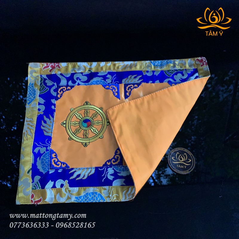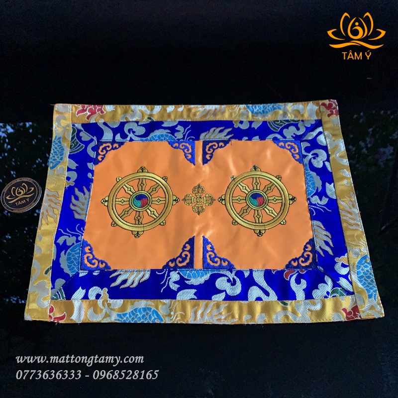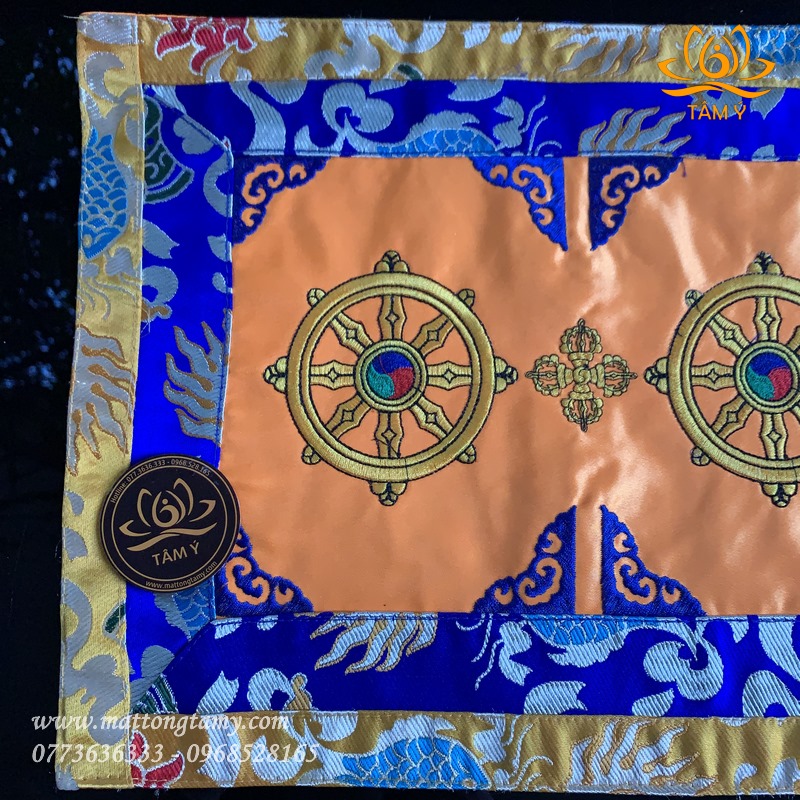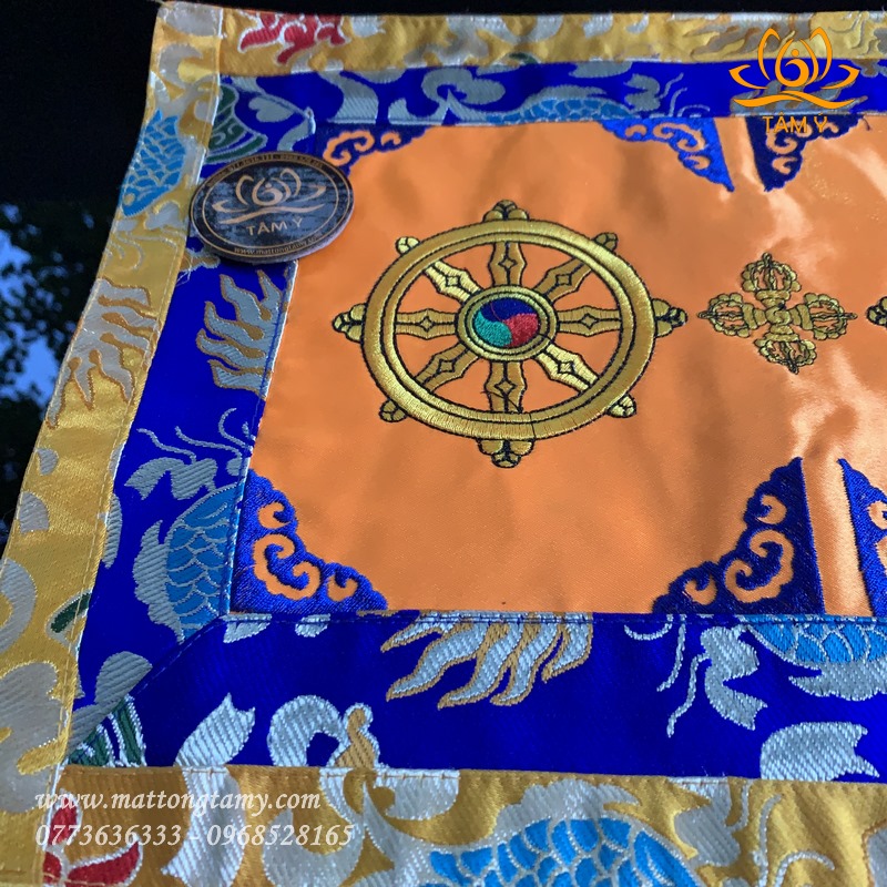 - Kiểu dáng: thêu 2 bánh xe Pháp luân và chày kim cang kép