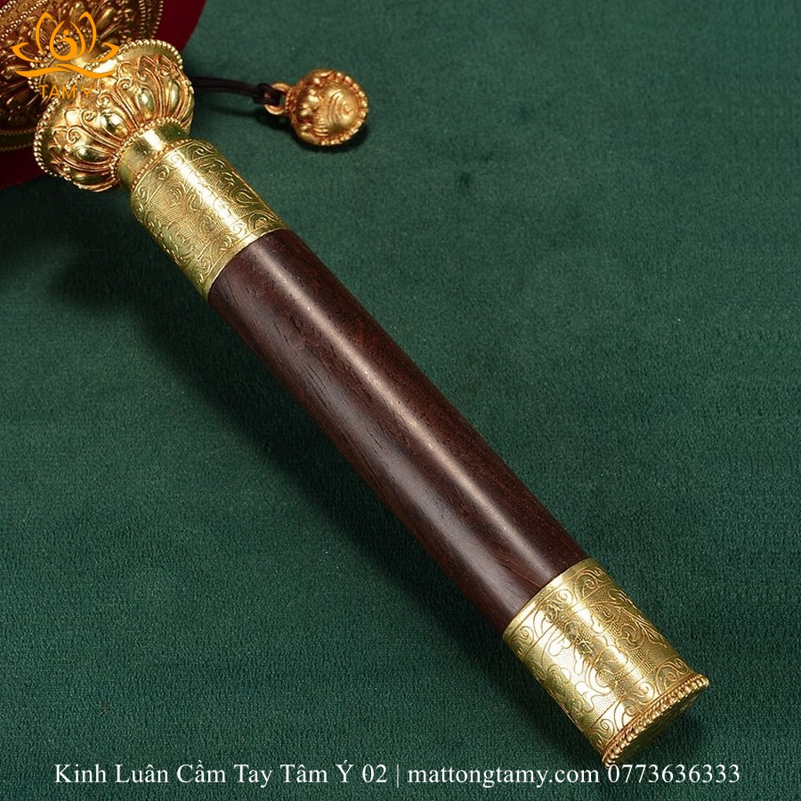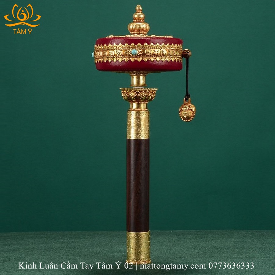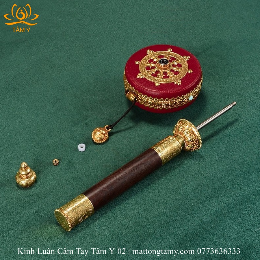 Chất liệu: Cán gỗ quý, rất nhẹ và bền. Kinh luân bằng đồng bọc da thật màu đỏ