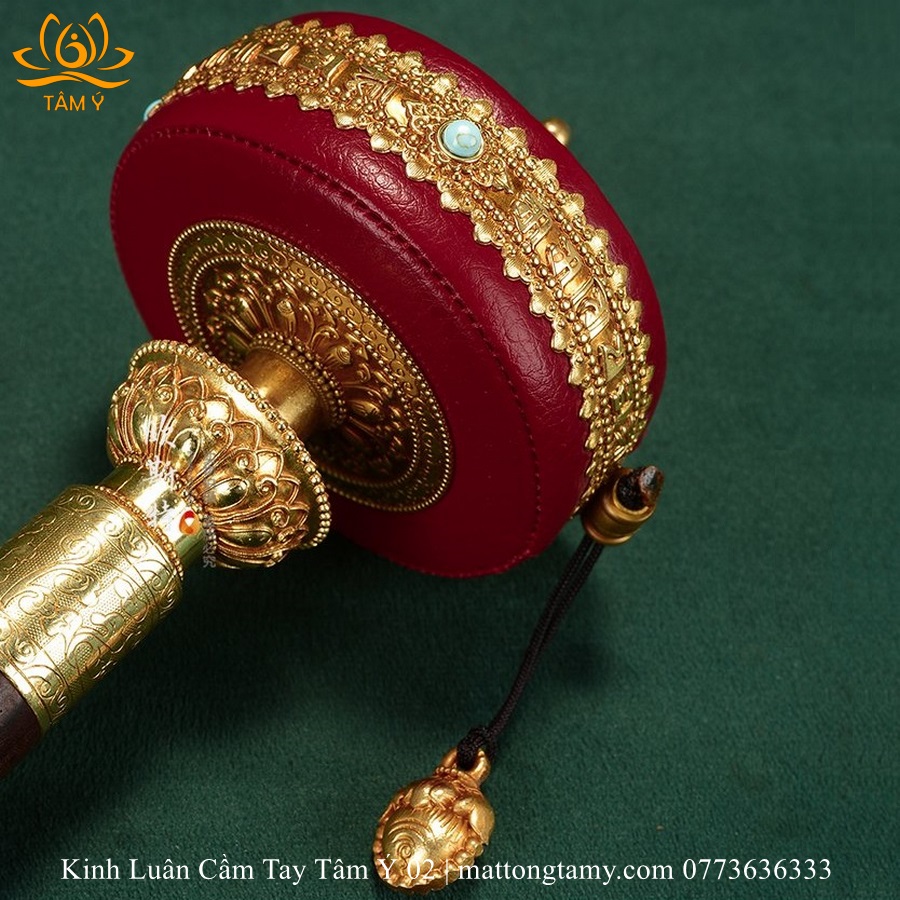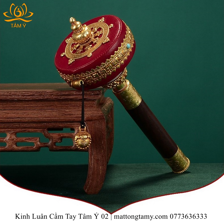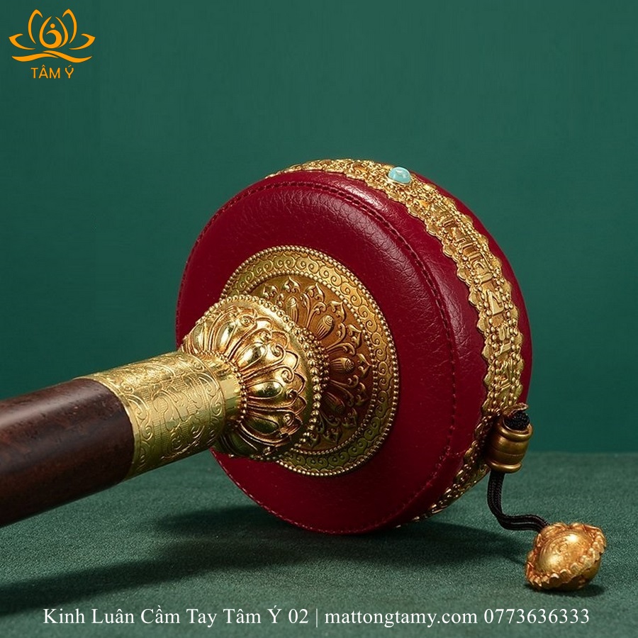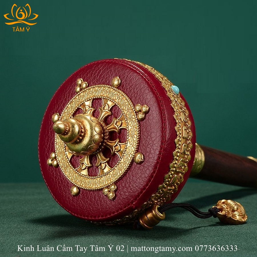 |Lõi Giấy| Kinh Luân Cầm Tay Bằng Đồng Bọc Da Thật Màu Đỏ, Cán Bằng Gỗ Quý KLCT04