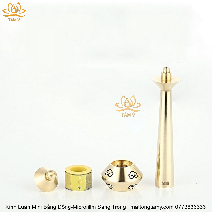 - Lõi kinh luân là 1 cuộn Microfilm, dùng công nghệ nano ghi chữ kinh văn lên các tấm film sau đó cho vào máy cuộn thật chặt lại. (quý khách lưu ý: không mở cuộn film ra vì máy cuộn nén rất chặt để thu nhỏ kích thước tối đa, nếu mở ra thì film bung ra sẽ không thể cuộn lại như ban đầu).