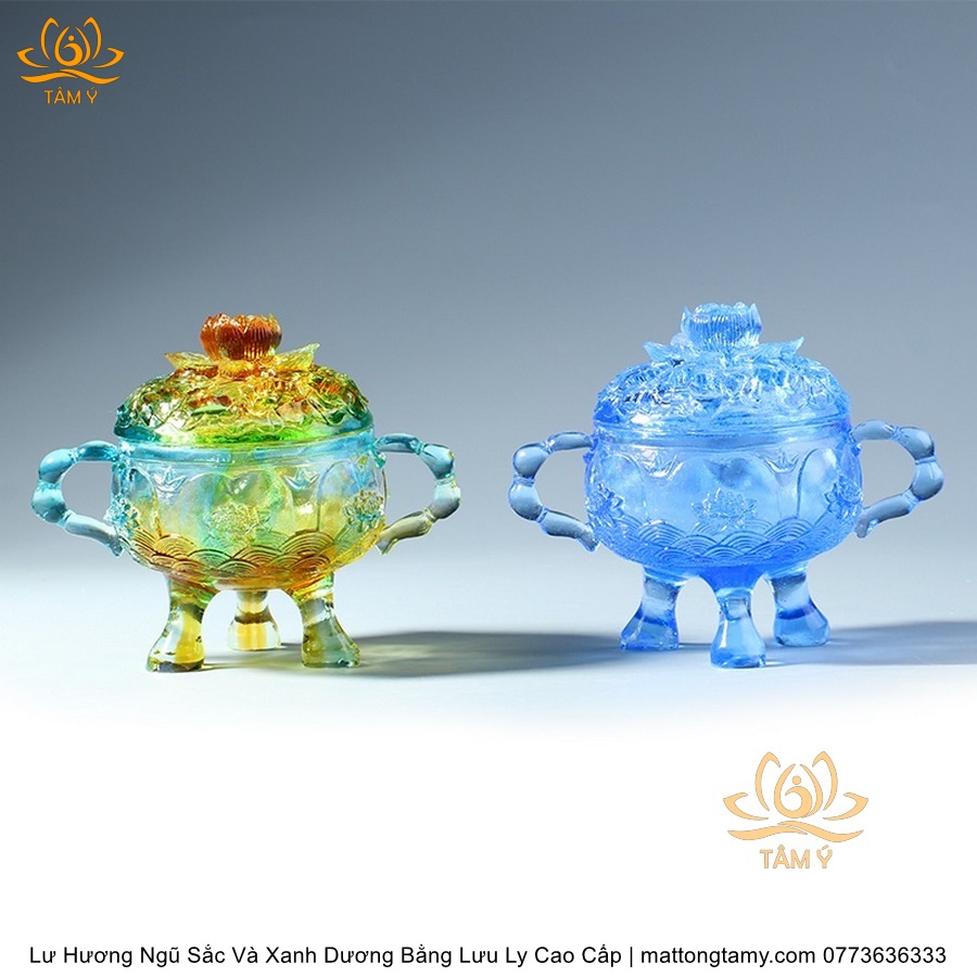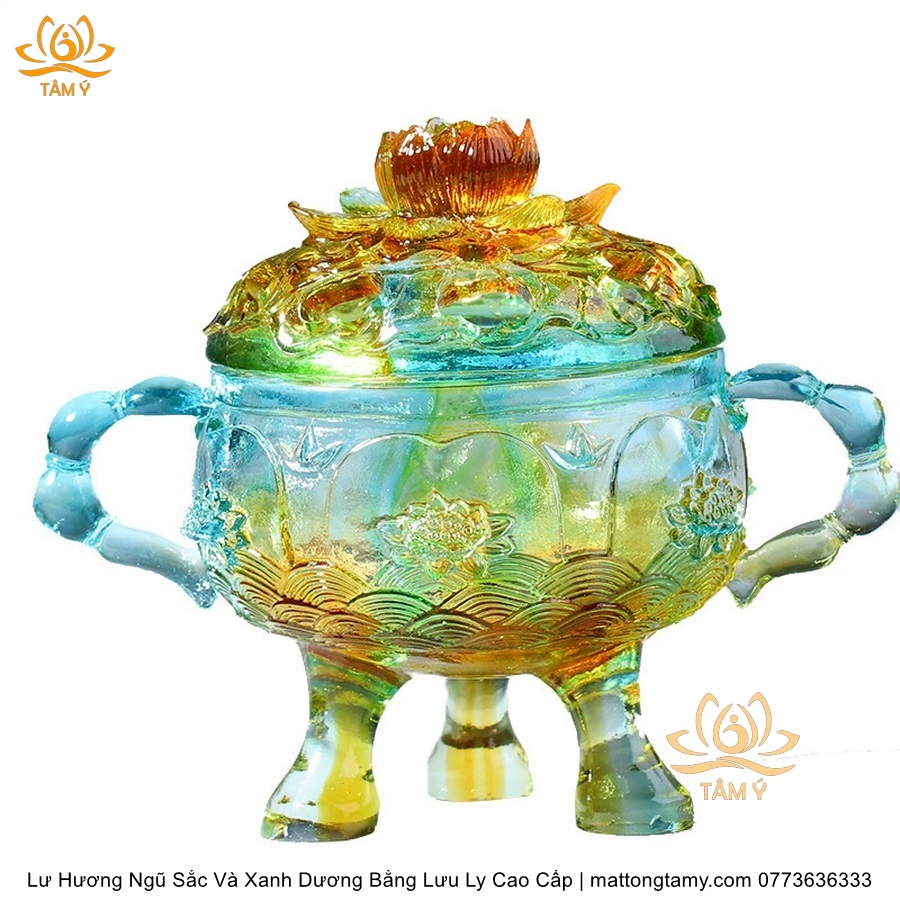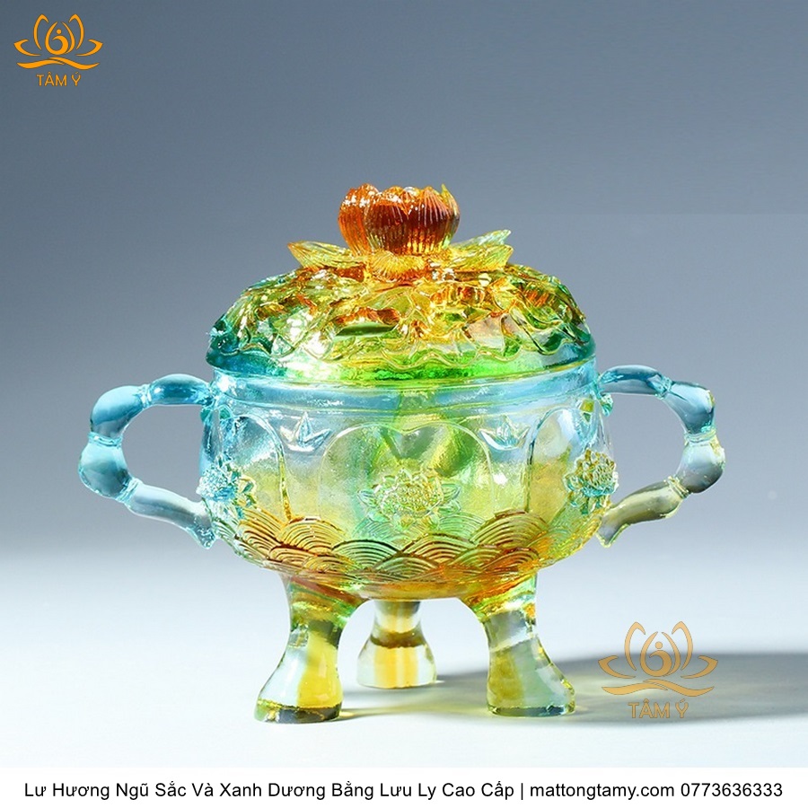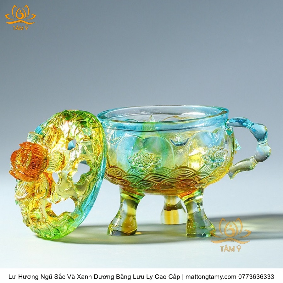 Lư Hương Có Nắp Lưu Ly Hình Đóa Sen Của Quan Âm Bồ Tát Mini Nhỏ Gọn, Họa Tiết Công Phu, Bắt Mắt