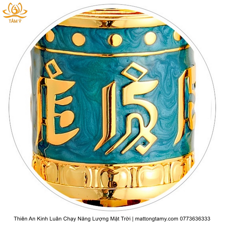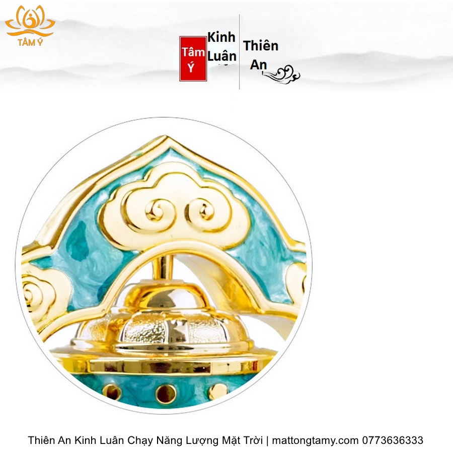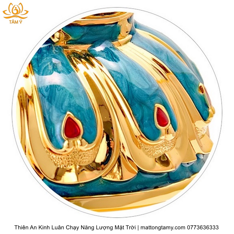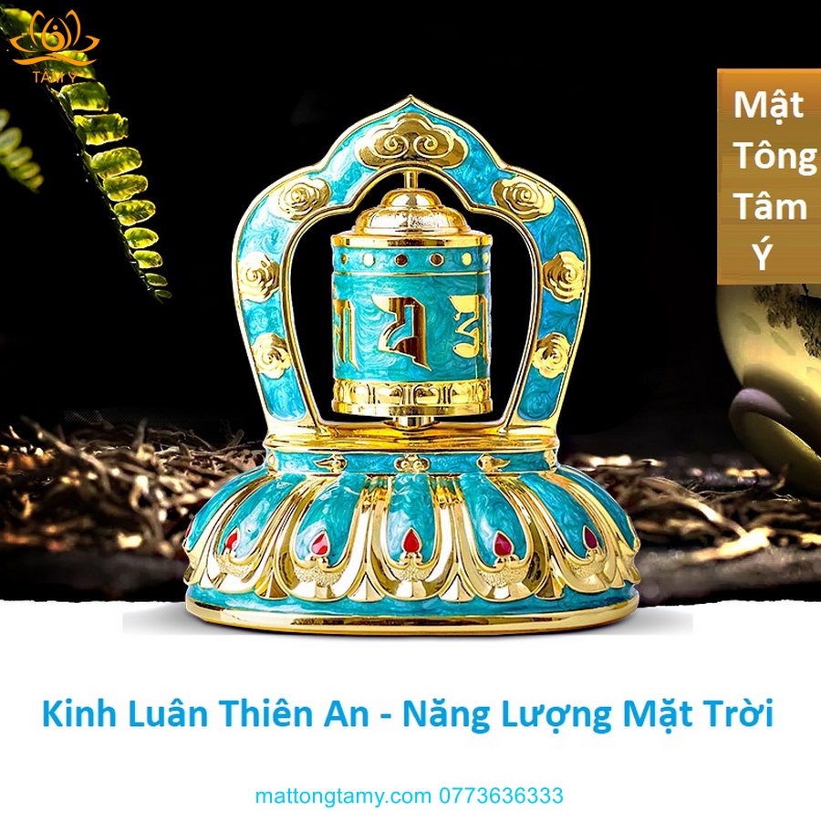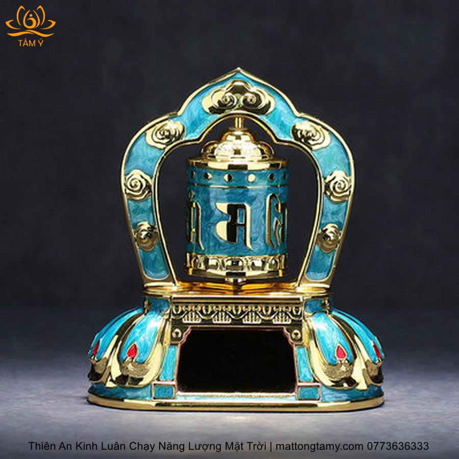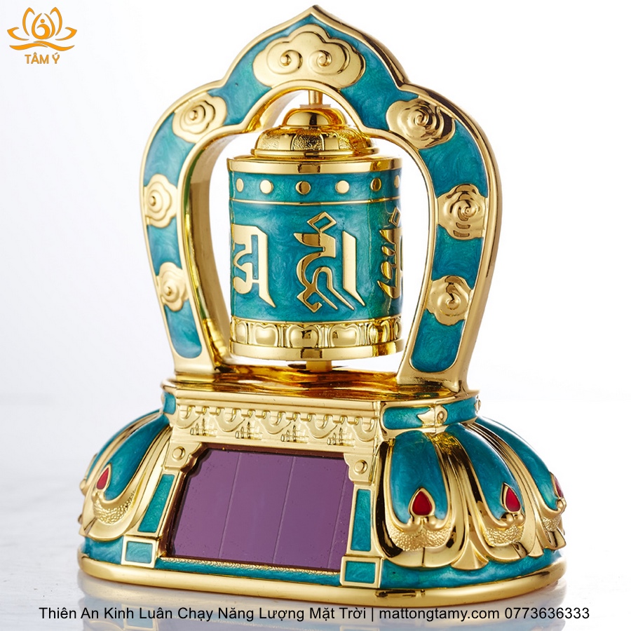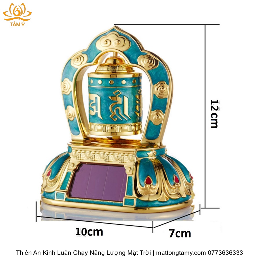 Chất liệu: Hợp kim nạm men ngọc. Kích thước ~12cmx9cmx7,5cm. Các biểu tượng: Ngọc báu mani, Thần thú bảo hộ (Rồng,Phượng), Lục tự đại minh. Sử dụng pin và miếng năng lượng mặt trời
