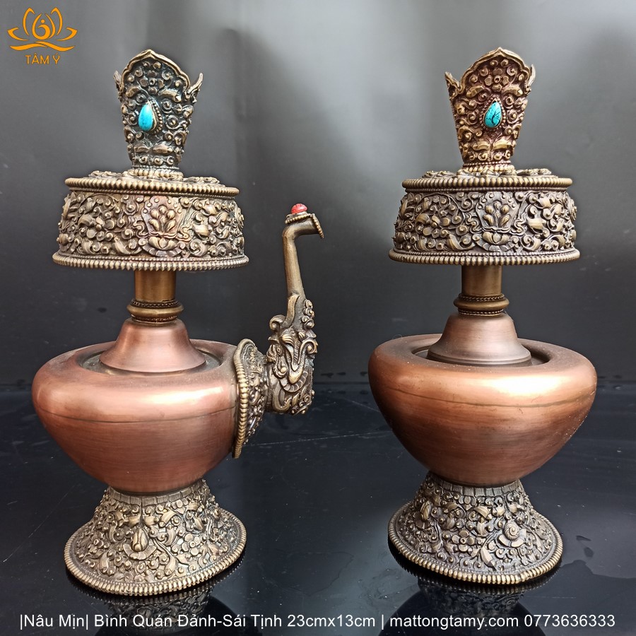 |Màu Nâu Mịn| Bộ Đôi Bình Quán Đảnh - Sái Tịnh Bằng Đồng Nguyên Chất, Hàng Thủ Công Nepal 23cmX13cm