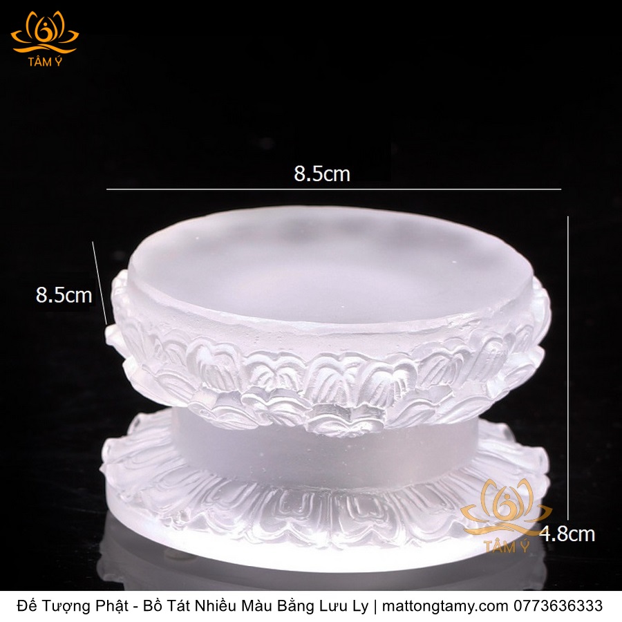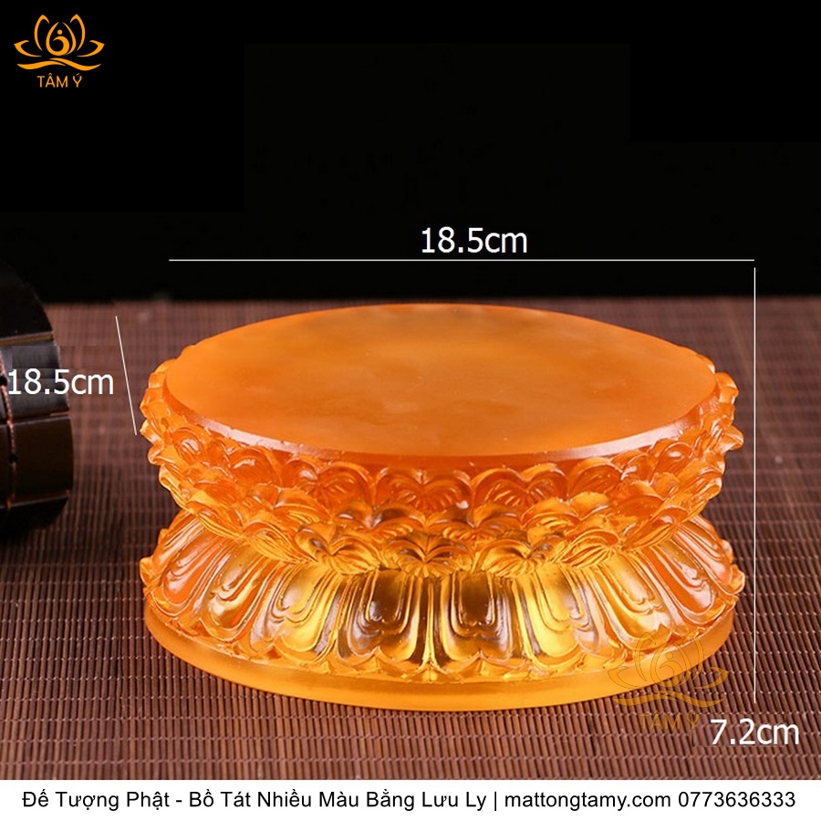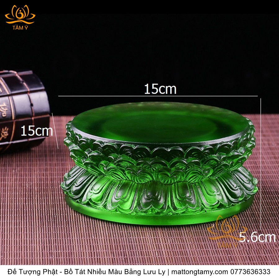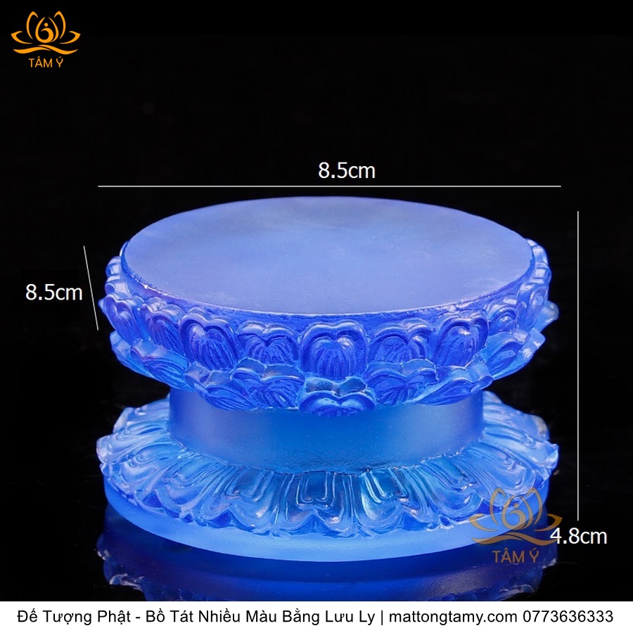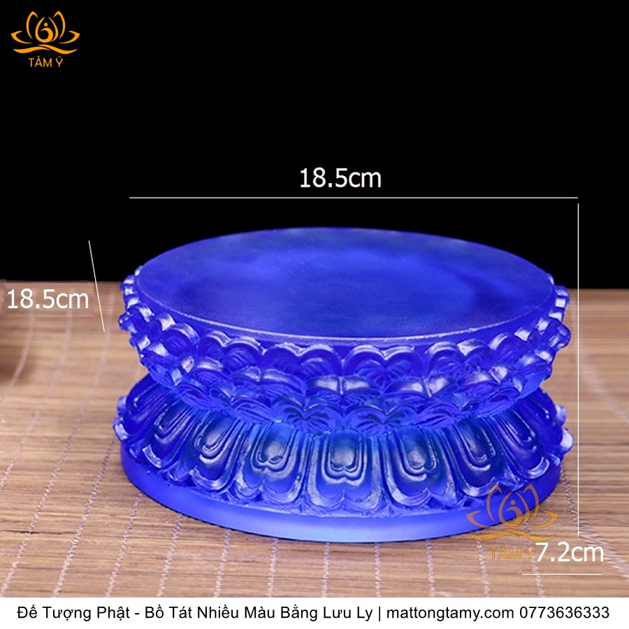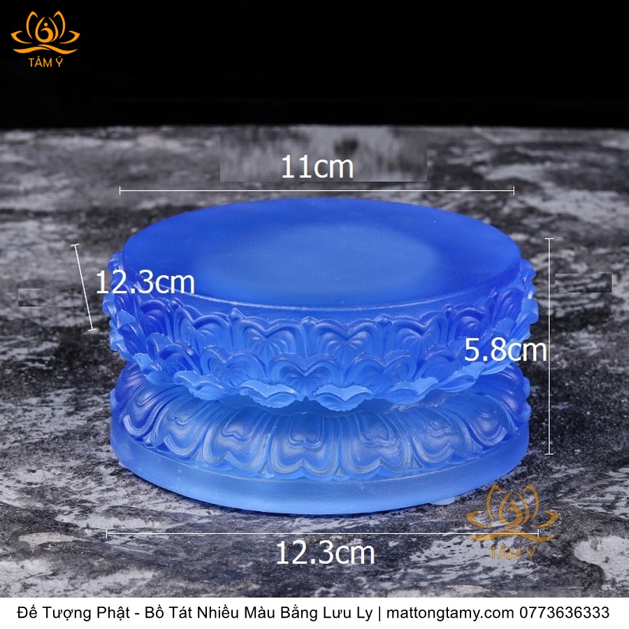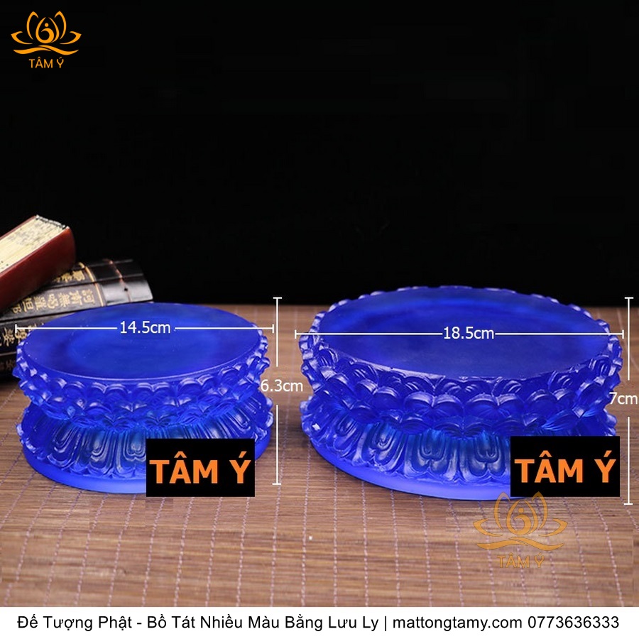Chất liệu: Lưu Ly Cao Cấp. Phân Loại: Đế tượng. Kích thước: Siêu Nhỏ: Cao 5cm, dài 9cm, rộng 7.8cm. Nhỏ: Cao 6cm, dài 14cm, rộng 11cm. Vừa: Cao 6.8cm, dài 18.5cm, rộng 15.5cm. Lớn: Cao 7cm, dài 22.5cm, rộng 18cm. Siêu Lớn: Cao 8.5cm, dài 27.5cm, rộng 23cm. Siêu Siêu Lớn: Cao 10.5cm, dài 34cm, rộng 29cm. Màu sắc: xanh dương, xanh lá, hổ phách, trắng.