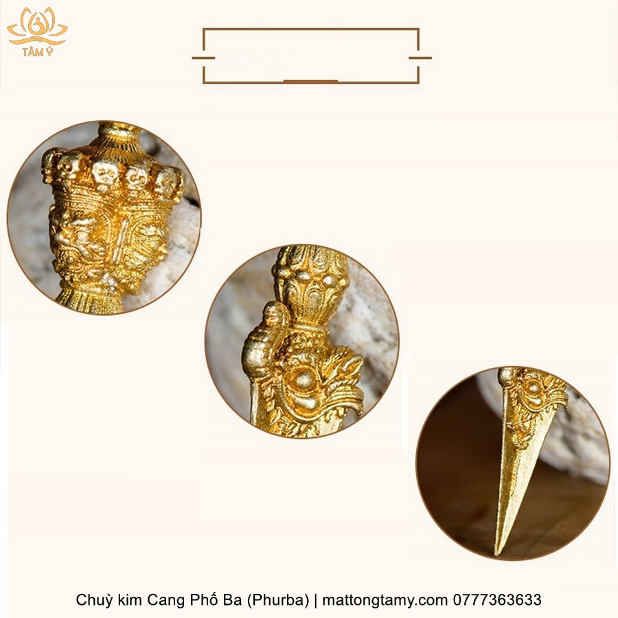 Chùy gồm 3 phần: Phần đỉnh thông thường là cắt nửa chày Kim cương, đại diện cho tam mật hoặc đầu Phật, đầu ngựa (mã đầu minh vương). Tiếp theo đến 3 mặt tướng phẫn nộ, tượng trưng cho tam mật và tam độc. Cán chày được trang trí dây cát tường kết, tiếp theo là hoa sen. Ba mặt của thân chày được trang trí bằng đôi rồng rắn đại diện cho 6 ba la mật. Lưỡi dao gồm 3 mặt mũi sắc nhọn tượng trưng cho tam giới và tam thế.