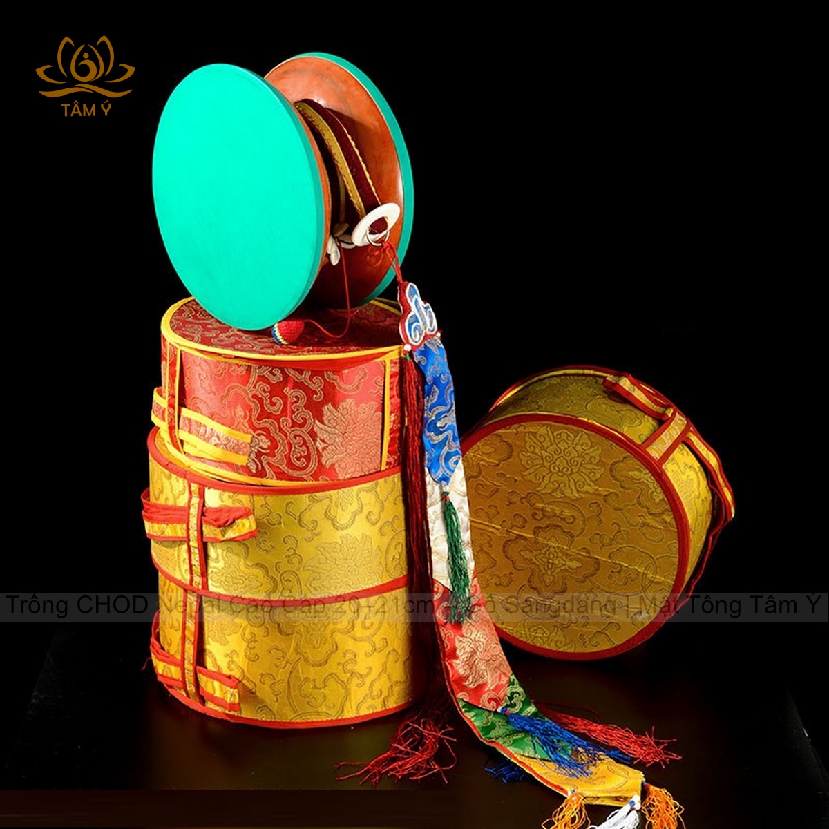 🌈 Pháp khí trống chod và damaru của Phật Giáo Mật Tông Tây Tạng, là trống cầm tay có 2 mặt, tiếng trống thể hiện âm của tính không. Thân trống thường được làm bằng gỗ, hoặc có thể bằng xương sọ người, mặt trống được làm bằng da bò hoặc da dê, có nhiều kích cỡ.